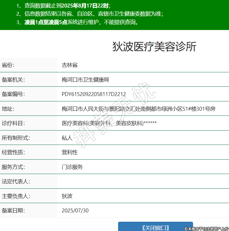 省份:吉林省備案機關(guān):梅河口市衛(wèi)生健康局備案編號:PDY61520922058117D2212地址:梅河口市人民大街與景陽路交匯處南側(cè)都市綠洲小區(qū)S1#樓301號房診療科目:醫(yī)療美容科(美容外科、美容皮膚科)******所有制形式:私人經(jīng)營性質(zhì):營利性服務(wù)方式:門診服務(wù)法定代表人:主要負責(zé)人:狄波備案日期:2025/07/30 -