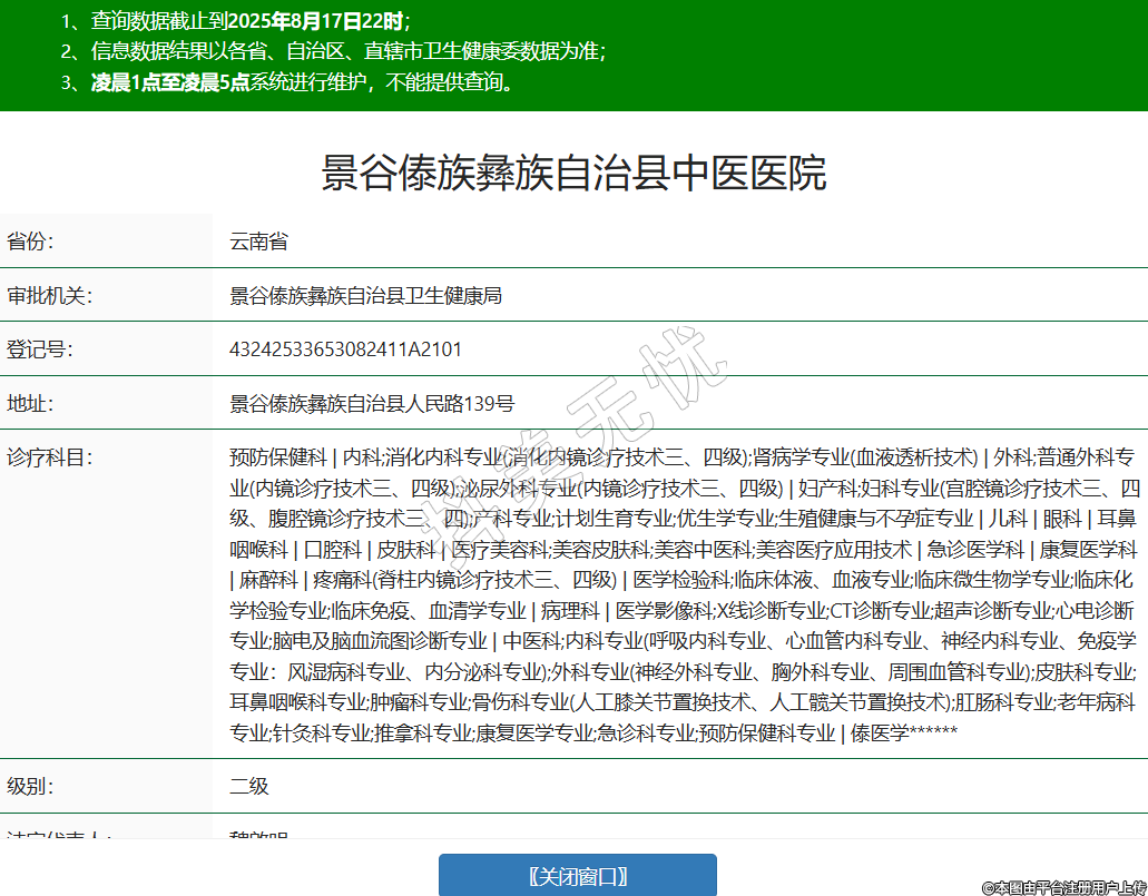 省份:云南省審批機關(guān):景谷傣族彝族自治縣衛(wèi)生健康局登記號:43242533653082411A2101地址:景谷傣族彝族自治縣人民路139號診療科目:預(yù)防保健科 | 內(nèi)科;消化內(nèi)科專業(yè)(消化內(nèi)鏡診療技術(shù)三、四級);腎病學(xué)專業(yè)(血液透析技術(shù)) | 外科;普通外科專業(yè)(內(nèi)鏡診療技術(shù)三、四級);泌尿外科專業(yè)(內(nèi)鏡診療技術(shù)三、四級) | 婦產(chǎn)科;婦科專業(yè)(宮腔鏡診療技術(shù)三、四級、腹腔鏡診療技術(shù)三、四);產(chǎn)科專業(yè);計劃生育專業(yè);優(yōu)生學(xué)專業(yè);生殖健康與不孕癥專業(yè) | 兒科 | 眼科 | 耳鼻咽喉科 | 口腔科 | 皮膚科 | 醫(yī)療美容科;美容皮膚科;美容中醫(yī)科;美容醫(yī)療應(yīng)用技術(shù) | 急診醫(yī)學(xué)科 | 康復(fù)醫(yī)學(xué)科 | 麻醉科 | 疼痛科(脊柱內(nèi)鏡診療技術(shù)三、四級) | 醫(yī)學(xué)檢驗科;臨床體液、血液專業(yè);臨床微生物學(xué)專業(yè);臨床化學(xué)檢驗專業(yè);臨床免疫、血清學(xué)專業(yè) | 病理科 | 醫(yī)學(xué)影像科;X線診斷專業(yè);CT診斷專業(yè);超聲診斷專業(yè);心電診斷專業(yè);腦電及腦血流圖診斷專業(yè) | 中醫(yī)科;內(nèi)科專業(yè)(呼吸內(nèi)科專業(yè)、心血管內(nèi)科專業(yè)、神經(jīng)內(nèi)科專業(yè)、免疫學(xué)專業(yè):風(fēng)濕病科專業(yè)、內(nèi)分泌科專業(yè));外科專業(yè)(神經(jīng)外科專業(yè)、胸外科專業(yè)、周圍血管科專業(yè));皮膚科專業(yè);耳鼻咽喉科專業(yè);腫瘤科專業(yè);骨傷科專業(yè)(人工膝關(guān)節(jié)置換技術(shù)、人工髖關(guān)節(jié)置換技術(shù));肛腸科專業(yè);老年病科專業(yè);針灸科專業(yè);推拿科專業(yè);康復(fù)醫(yī)學(xué)專業(yè);急診科專業(yè);預(yù)防保健科專業(yè) | 傣醫(yī)學(xué)******級別:二級法定代表人:魏啟明主要負(fù)責(zé)人:魏啟明執(zhí)業(yè)許可證有效期:2013/02/20 -至- 2028/02/20 -