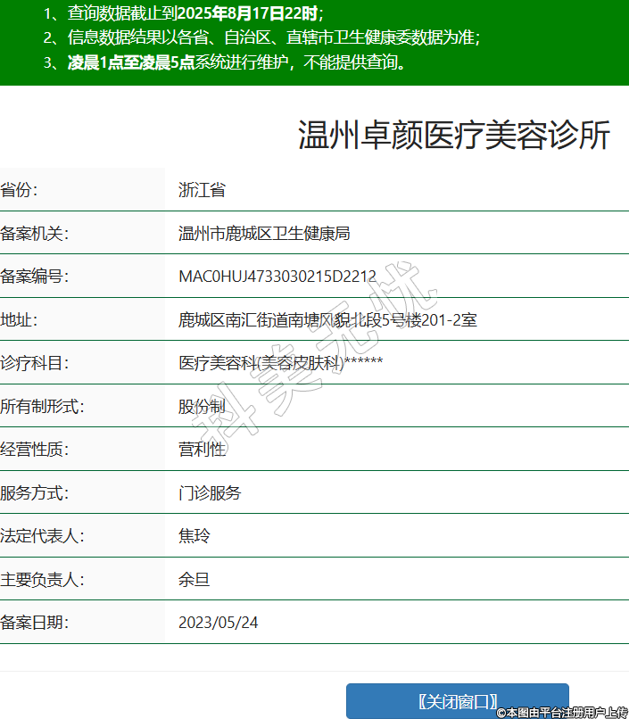省份:浙江省備案機(jī)關(guān):溫州市鹿城區(qū)衛(wèi)生健康局備案編號(hào):MAC0HUJ4733030215D2212地址:鹿城區(qū)南匯街道南塘風(fēng)貌北段5號(hào)樓201-2室診療科目:醫(yī)療美容科(美容皮膚科)******所有制形式:股份制經(jīng)營(yíng)性質(zhì):營(yíng)利性服務(wù)方式:門(mén)診服務(wù)法定代表人:焦玲主要負(fù)責(zé)人:余旦備案日期:2023/05/24 -
