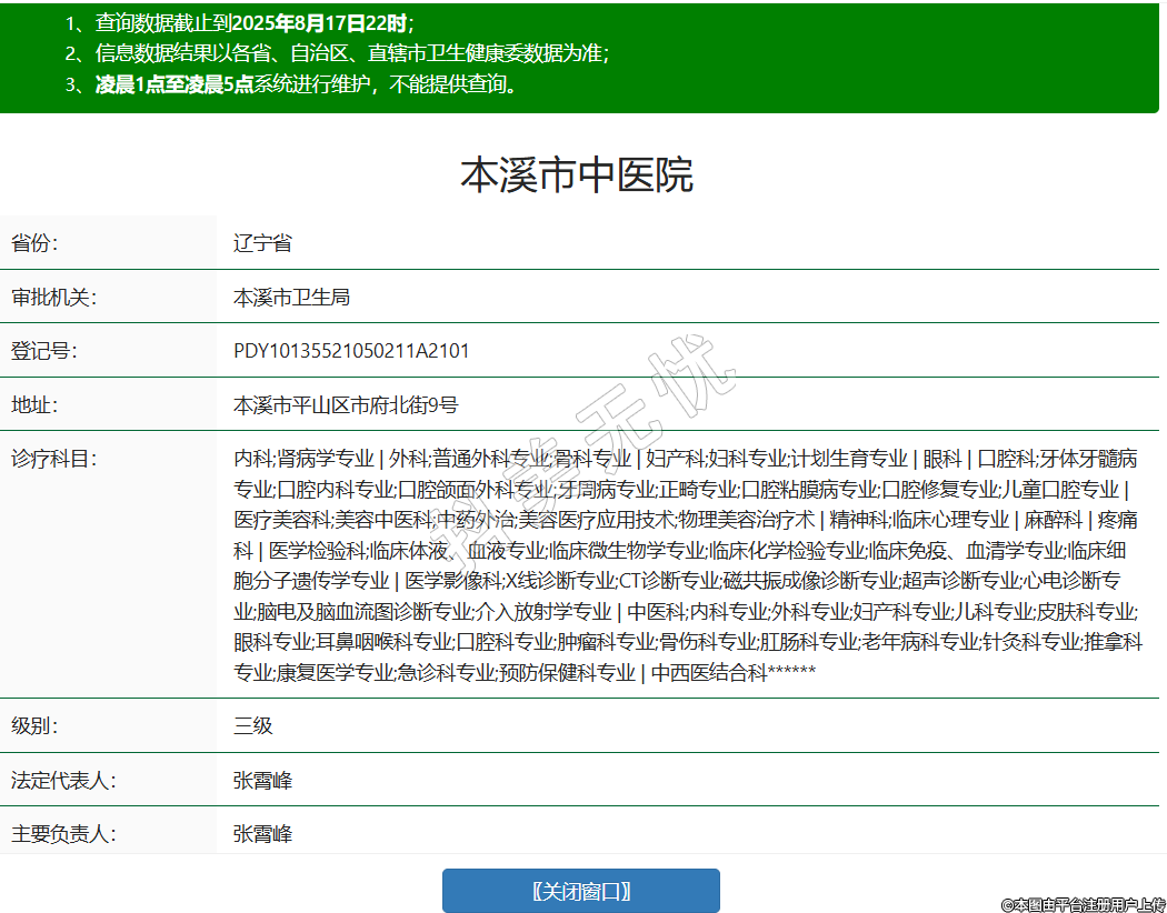 省份:遼寧省審批機(jī)關(guān):本溪市衛(wèi)生局登記號(hào):PDY10135521050211A2101地址:本溪市平山區(qū)市府北街9號(hào)診療科目:內(nèi)科;腎病學(xué)專業(yè) | 外科;普通外科專業(yè);骨科專業(yè) | 婦產(chǎn)科;婦科專業(yè);計(jì)劃生育專業(yè) | 眼科 | 口腔科;牙體牙髓病專業(yè);口腔內(nèi)科專業(yè);口腔頜面外科專業(yè);牙周病專業(yè);正畸專業(yè);口腔粘膜病專業(yè);口腔修復(fù)專業(yè);兒童口腔專業(yè) | 醫(yī)療美容科;美容中醫(yī)科;中藥外治;美容醫(yī)療應(yīng)用技術(shù);物理美容治療術(shù) | 精神科;臨床心理專業(yè) | 麻醉科 | 疼痛科 | 醫(yī)學(xué)檢驗(yàn)科;臨床體液、血液專業(yè);臨床微生物學(xué)專業(yè);臨床化學(xué)檢驗(yàn)專業(yè);臨床免疫、血清學(xué)專業(yè);臨床細(xì)胞分子遺傳學(xué)專業(yè) | 醫(yī)學(xué)影像科;X線診斷專業(yè);CT診斷專業(yè);磁共振成像診斷專業(yè);超聲診斷專業(yè);心電診斷專業(yè);腦電及腦血流圖診斷專業(yè);介入放射學(xué)專業(yè) | 中醫(yī)科;內(nèi)科專業(yè);外科專業(yè);婦產(chǎn)科專業(yè);兒科專業(yè);皮膚科專業(yè);眼科專業(yè);耳鼻咽喉科專業(yè);口腔科專業(yè);腫瘤科專業(yè);骨傷科專業(yè);肛腸科專業(yè);老年病科專業(yè);針灸科專業(yè);推拿科專業(yè);康復(fù)醫(yī)學(xué)專業(yè);急診科專業(yè);預(yù)防保健科專業(yè) | 中西醫(yī)結(jié)合科******級(jí)別:三級(jí)法定代表人:張霄峰主要負(fù)責(zé)人:張霄峰執(zhí)業(yè)許可證有效期:2012/03/30 -至- 2027/03/30 -