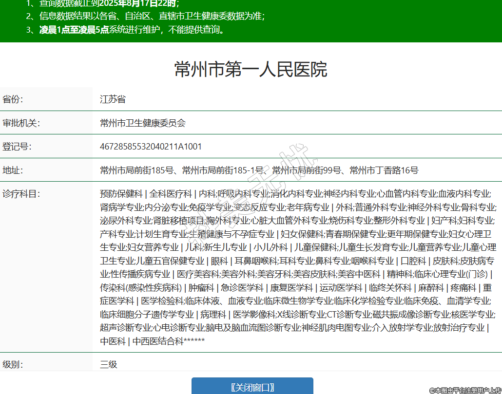 省份:江蘇省審批機關(guān):常州市衛(wèi)生健康委員會登記號:46728585532040211A1001地址:常州市局前街185號、常州市局前街185-1號、常州市局前街99號、常州市丁香路16號診療科目:預(yù)防保健科 | 全科醫(yī)療科 | 內(nèi)科;呼吸內(nèi)科專業(yè);消化內(nèi)科專業(yè);神經(jīng)內(nèi)科專業(yè);心血管內(nèi)科專業(yè);血液內(nèi)科專業(yè);腎病學(xué)專業(yè);內(nèi)分泌專業(yè);免疫學(xué)專業(yè);變態(tài)反應(yīng)專業(yè);老年病專業(yè) | 外科;普通外科專業(yè);神經(jīng)外科專業(yè);骨科專業(yè);泌尿外科專業(yè);腎臟移植項目;胸外科專業(yè);心臟大血管外科專業(yè);燒傷科專業(yè);整形外科專業(yè) | 婦產(chǎn)科;婦科專業(yè);產(chǎn)科專業(yè);計劃生育專業(yè);生殖健康與不孕癥專業(yè) | 婦女保健科;青春期保健專業(yè);更年期保健專業(yè);婦女心理衛(wèi)生專業(yè);婦女營養(yǎng)專業(yè) | 兒科;新生兒專業(yè) | 小兒外科 | 兒童保健科;兒童生長發(fā)育專業(yè);兒童營養(yǎng)專業(yè);兒童心理衛(wèi)生專業(yè);兒童五官保健專業(yè) | 眼科 | 耳鼻咽喉科;耳科專業(yè);鼻科專業(yè);咽喉科專業(yè) | 口腔科 | 皮膚科;皮膚病專業(yè);性傳播疾病專業(yè) | 醫(yī)療美容科;美容外科;美容牙科;美容皮膚科;美容中醫(yī)科 | 精神科;臨床心理專業(yè)(門診) | 傳染科(感染性疾病科) | 腫瘤科 | 急診醫(yī)學(xué)科 | 康復(fù)醫(yī)學(xué)科 | 運動醫(yī)學(xué)科 | 臨終關(guān)懷科 | 麻醉科 | 疼痛科 | 重癥醫(yī)學(xué)科 | 醫(yī)學(xué)檢驗科;臨床體液、血液專業(yè);臨床微生物學(xué)專業(yè);臨床化學(xué)檢驗專業(yè);臨床免疫、血清學(xué)專業(yè);臨床細胞分子遺傳學(xué)專業(yè) | 病理科 | 醫(yī)學(xué)影像科;X線診斷專業(yè);CT診斷專業(yè);磁共振成像診斷專業(yè);核醫(yī)學(xué)專業(yè);超聲診斷專業(yè);心電診斷專業(yè);腦電及腦血流圖診斷專業(yè);神經(jīng)肌肉電圖專業(yè);介入放射學(xué)專業(yè);放射治療專業(yè) | 中醫(yī)科 | 中西醫(yī)結(jié)合科******級別:三級法定代表人:周軍主要負責(zé)人:周軍執(zhí)業(yè)許可證有效期:2024/09/11 -至- 2035/01/17 -