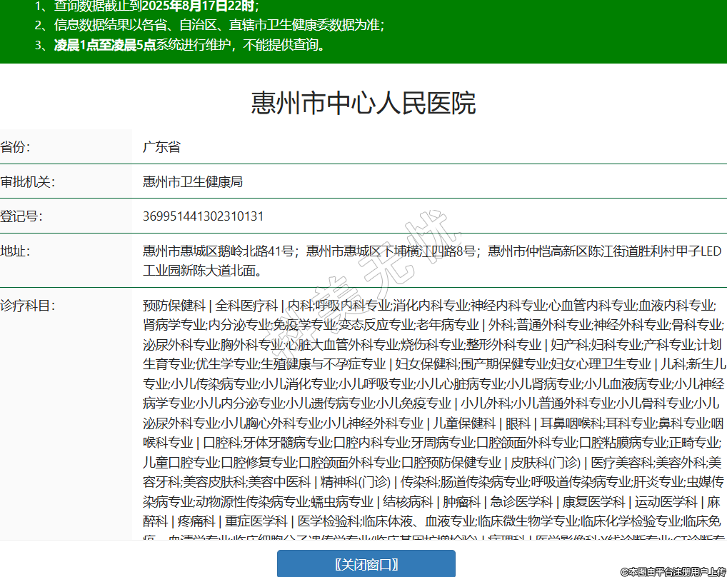 省份:廣東省審批機(jī)關(guān):惠州市衛(wèi)生健康局登記號(hào):369951441302310131地址:惠州市惠城區(qū)鵝嶺北路41號(hào);惠州市惠城區(qū)下埔橫江四路8號(hào);惠州市仲愷高新區(qū)陳江街道勝利村甲子LED工業(yè)園新陳大道北面。診療科目:預(yù)防保健科 | 全科醫(yī)療科 | 內(nèi)科;呼吸內(nèi)科專業(yè);消化內(nèi)科專業(yè);神經(jīng)內(nèi)科專業(yè);心血管內(nèi)科專業(yè);血液內(nèi)科專業(yè);腎病學(xué)專業(yè);內(nèi)分泌專業(yè);免疫學(xué)專業(yè);變態(tài)反應(yīng)專業(yè);老年病專業(yè) | 外科;普通外科專業(yè);神經(jīng)外科專業(yè);骨科專業(yè);泌尿外科專業(yè);胸外科專業(yè);心臟大血管外科專業(yè);燒傷科專業(yè);整形外科專業(yè) | 婦產(chǎn)科;婦科專業(yè);產(chǎn)科專業(yè);計(jì)劃生育專業(yè);優(yōu)生學(xué)專業(yè);生殖健康與不孕癥專業(yè) | 婦女保健科;圍產(chǎn)期保健專業(yè);婦女心理衛(wèi)生專業(yè) | 兒科;新生兒專業(yè);小兒傳染病專業(yè);小兒消化專業(yè);小兒呼吸專業(yè);小兒心臟病專業(yè);小兒腎病專業(yè);小兒血液病專業(yè);小兒神經(jīng)病學(xué)專業(yè);小兒內(nèi)分泌專業(yè);小兒遺傳病專業(yè);小兒免疫專業(yè) | 小兒外科;小兒普通外科專業(yè);小兒骨科專業(yè);小兒泌尿外科專業(yè);小兒胸心外科專業(yè);小兒神經(jīng)外科專業(yè) | 兒童保健科 | 眼科 | 耳鼻咽喉科;耳科專業(yè);鼻科專業(yè);咽喉科專業(yè) | 口腔科;牙體牙髓病專業(yè);口腔內(nèi)科專業(yè);牙周病專業(yè);口腔頜面外科專業(yè);口腔粘膜病專業(yè);正畸專業(yè);兒童口腔專業(yè);口腔修復(fù)專業(yè);口腔頜面外科專業(yè);口腔預(yù)防保健專業(yè) | 皮膚科(門診) | 醫(yī)療美容科;美容外科;美容牙科;美容皮膚科;美容中醫(yī)科 | 精神科(門診) | 傳染科;腸道傳染病專業(yè);呼吸道傳染病專業(yè);肝炎專業(yè);蟲媒傳染病專業(yè);動(dòng)物源性傳染病專業(yè);蠕蟲病專業(yè) | 結(jié)核病科 | 腫瘤科 | 急診醫(yī)學(xué)科 | 康復(fù)醫(yī)學(xué)科 | 運(yùn)動(dòng)醫(yī)學(xué)科 | 麻醉科 | 疼痛科 | 重癥醫(yī)學(xué)科 | 醫(yī)學(xué)檢驗(yàn)科;臨床體液、血液專業(yè);臨床微生物學(xué)專業(yè);臨床化學(xué)檢驗(yàn)專業(yè);臨床免疫、血清學(xué)專業(yè);臨床細(xì)胞分子遺傳學(xué)專業(yè)(臨床基因擴(kuò)增檢驗(yàn)) | 病理科 | 醫(yī)學(xué)影像科;X線診斷專業(yè);CT診斷專業(yè);磁共振成像診斷專業(yè);核醫(yī)學(xué)專業(yè);超聲診斷專業(yè);心電診斷專業(yè);腦電及腦血流圖診斷專業(yè);神經(jīng)肌肉電圖專業(yè);介入放射學(xué)專業(yè);放射治療專業(yè) | 中醫(yī)科 | 中西醫(yī)結(jié)合科******級(jí)別:三級(jí)法定代表人:紀(jì)燕琴主要負(fù)責(zé)人:紀(jì)燕琴執(zhí)業(yè)許可證有效期:2024/03/20 -至- 2029/12/04 -