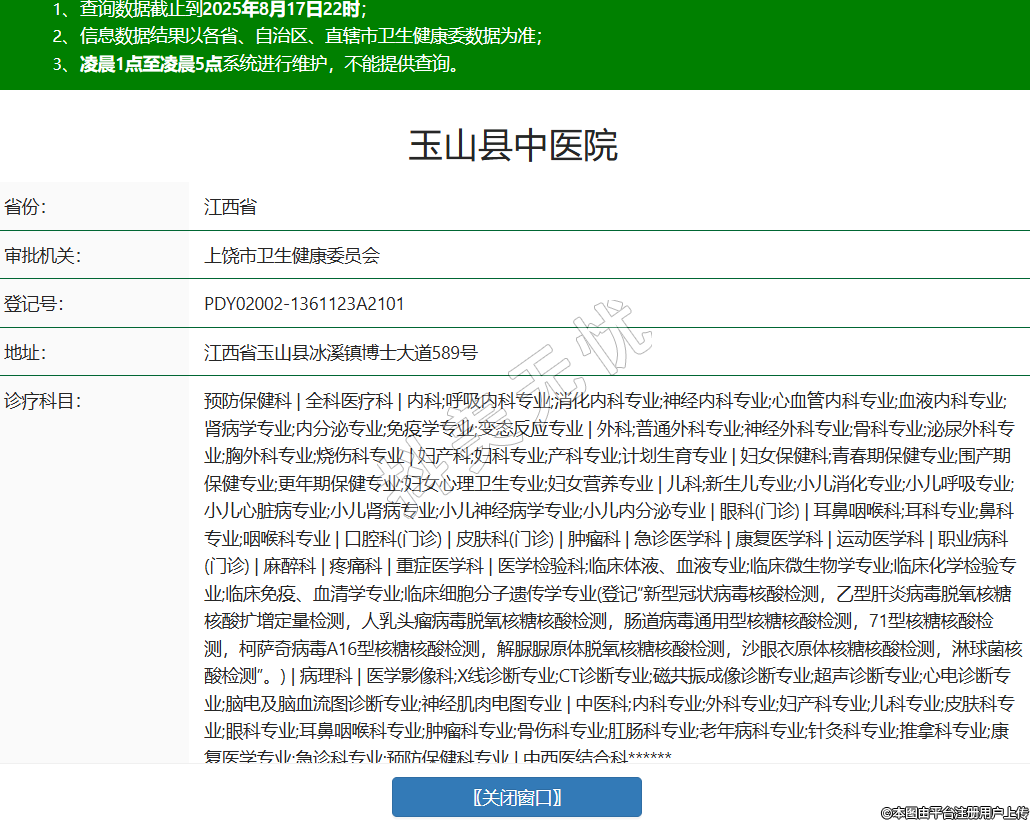 省份:江西省審批機(jī)關(guān):上饒市衛(wèi)生健康委員會(huì)登記號(hào):PDY02002-1361123A2101地址:江西省玉山縣冰溪鎮(zhèn)博士大道589號(hào)診療科目:預(yù)防保健科 | 全科醫(yī)療科 | 內(nèi)科;呼吸內(nèi)科專業(yè);消化內(nèi)科專業(yè);神經(jīng)內(nèi)科專業(yè);心血管內(nèi)科專業(yè);血液內(nèi)科專業(yè);腎病學(xué)專業(yè);內(nèi)分泌專業(yè);免疫學(xué)專業(yè);變態(tài)反應(yīng)專業(yè) | 外科;普通外科專業(yè);神經(jīng)外科專業(yè);骨科專業(yè);泌尿外科專業(yè);胸外科專業(yè);燒傷科專業(yè) | 婦產(chǎn)科;婦科專業(yè);產(chǎn)科專業(yè);計(jì)劃生育專業(yè) | 婦女保健科;青春期保健專業(yè);圍產(chǎn)期保健專業(yè);更年期保健專業(yè);婦女心理衛(wèi)生專業(yè);婦女營(yíng)養(yǎng)專業(yè) | 兒科;新生兒專業(yè);小兒消化專業(yè);小兒呼吸專業(yè);小兒心臟病專業(yè);小兒腎病專業(yè);小兒神經(jīng)病學(xué)專業(yè);小兒內(nèi)分泌專業(yè) | 眼科(門診) | 耳鼻咽喉科;耳科專業(yè);鼻科專業(yè);咽喉科專業(yè) | 口腔科(門診) | 皮膚科(門診) | 腫瘤科 | 急診醫(yī)學(xué)科 | 康復(fù)醫(yī)學(xué)科 | 運(yùn)動(dòng)醫(yī)學(xué)科 | 職業(yè)病科(門診) | 麻醉科 | 疼痛科 | 重癥醫(yī)學(xué)科 | 醫(yī)學(xué)檢驗(yàn)科;臨床體液、血液專業(yè);臨床微生物學(xué)專業(yè);臨床化學(xué)檢驗(yàn)專業(yè);臨床免疫、血清學(xué)專業(yè);臨床細(xì)胞分子遺傳學(xué)專業(yè)(登記“新型冠狀病毒核酸檢測(cè),乙型肝炎病毒脫氧核糖核酸擴(kuò)增定量檢測(cè),人乳頭瘤病毒脫氧核糖核酸檢測(cè),腸道病毒通用型核糖核酸檢測(cè),71型核糖核酸檢測(cè),柯薩奇病毒A16型核糖核酸檢測(cè),解脲脲原體脫氧核糖核酸檢測(cè),沙眼衣原體核糖核酸檢測(cè),淋球菌核酸檢測(cè)”。) | 病理科 | 醫(yī)學(xué)影像科;X線診斷專業(yè);CT診斷專業(yè);磁共振成像診斷專業(yè);超聲診斷專業(yè);心電診斷專業(yè);腦電及腦血流圖診斷專業(yè);神經(jīng)肌肉電圖專業(yè) | 中醫(yī)科;內(nèi)科專業(yè);外科專業(yè);婦產(chǎn)科專業(yè);兒科專業(yè);皮膚科專業(yè);眼科專業(yè);耳鼻咽喉科專業(yè);腫瘤科專業(yè);骨傷科專業(yè);肛腸科專業(yè);老年病科專業(yè);針灸科專業(yè);推拿科專業(yè);康復(fù)醫(yī)學(xué)專業(yè);急診科專業(yè);預(yù)防保健科專業(yè) | 中西醫(yī)結(jié)合科******級(jí)別:三級(jí)法定代表人:顧曉軍主要負(fù)責(zé)人:鄭防軍執(zhí)業(yè)許可證有效期:2021/02/24 -至- 2036/02/23 -
