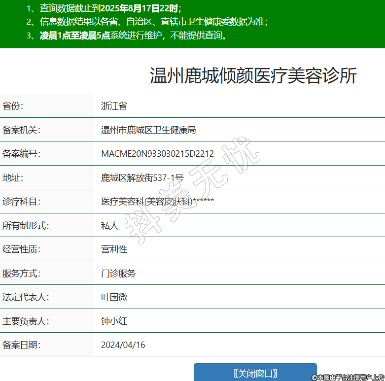 省份:浙江省備案機(jī)關(guān):溫州市鹿城區(qū)衛(wèi)生健康局備案編號(hào):MACME20N933030215D2212地址:鹿城區(qū)解放街537-1號(hào)診療科目:醫(yī)療美容科(美容皮膚科)******所有制形式:私人經(jīng)營(yíng)性質(zhì):營(yíng)利性服務(wù)方式:門診服務(wù)法定代表人:葉國(guó)微主要負(fù)責(zé)人:鐘小紅備案日期:2024/04/16 -