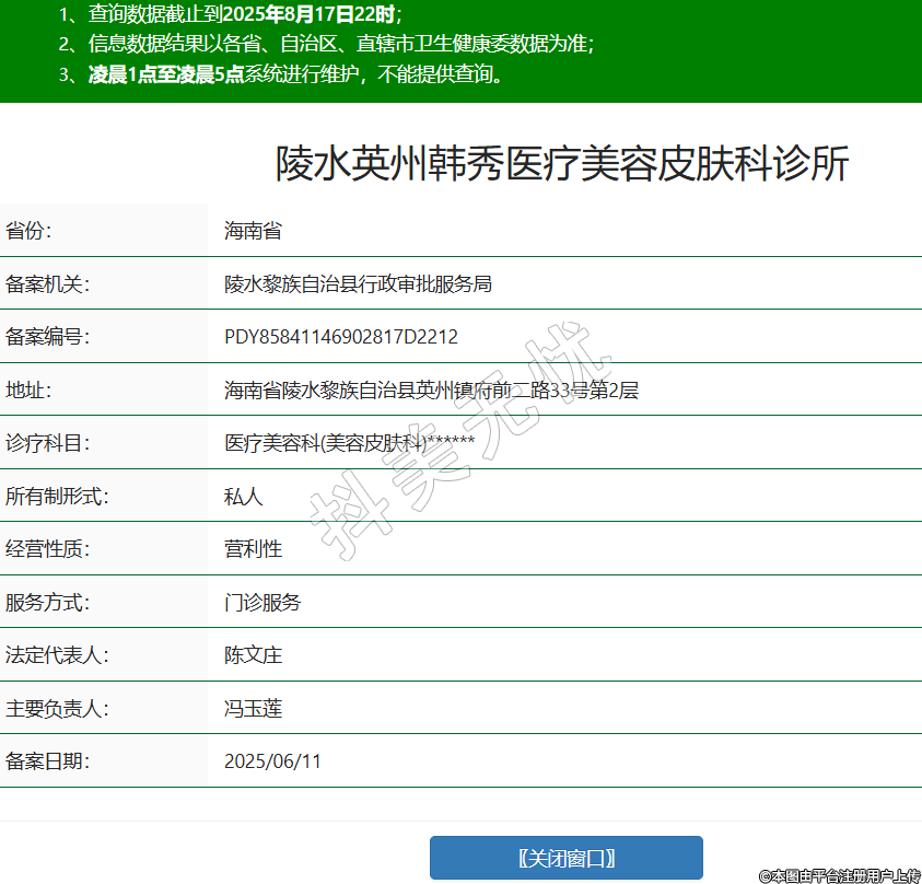 省份:海南省備案機(jī)關(guān):備案編號(hào):PDY85841146902817D2212地址:海南省陵水黎族自治縣英州鎮(zhèn)府前二路33號(hào)第2層診療科目:醫(yī)療美容科(美容皮膚科)******所有制形式:私人經(jīng)營(yíng)性質(zhì):營(yíng)利性服務(wù)方式:門診服務(wù)法定代表人:陳文莊主要負(fù)責(zé)人:馮玉蓮備案日期:2025/06/11 -