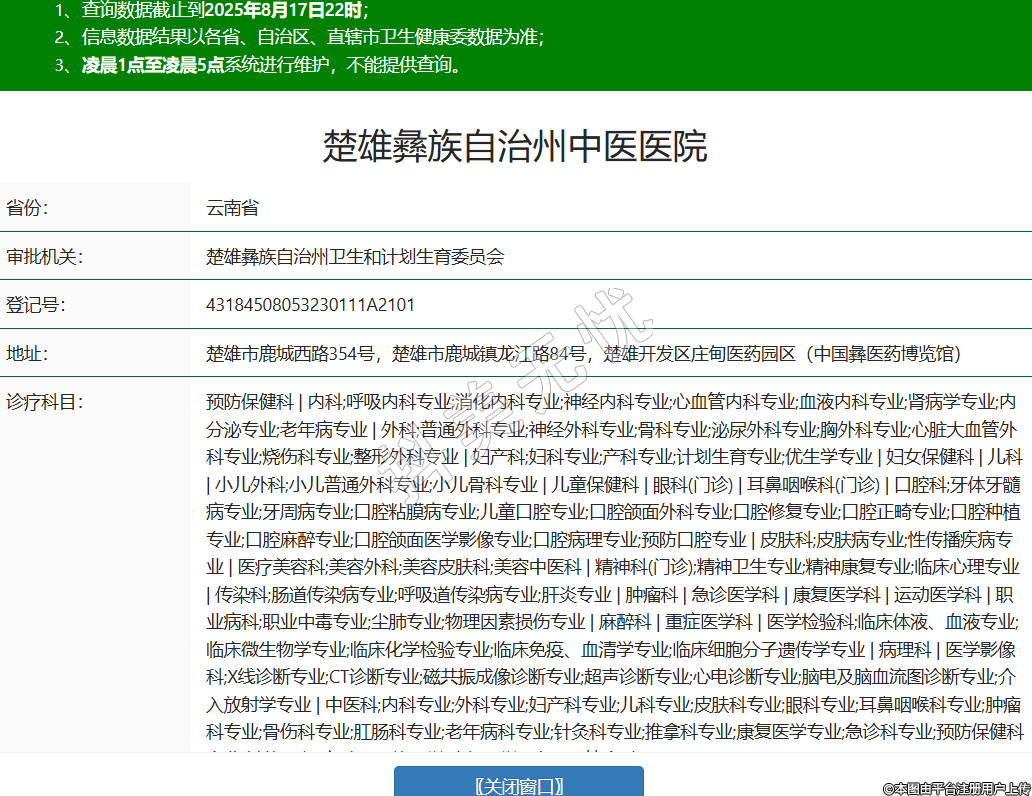 省份:云南省審批機(jī)關(guān):楚雄彝族自治州衛(wèi)生和計(jì)劃生育委員會(huì)登記號(hào):43184508053230111A2101地址:楚雄市鹿城西路354號(hào),楚雄市鹿城鎮(zhèn)龍江路84號(hào),楚雄開(kāi)發(fā)區(qū)莊甸醫(yī)藥園區(qū)(中國(guó)彝醫(yī)藥博覽館)診療科目:預(yù)防保健科 | 內(nèi)科;呼吸內(nèi)科專(zhuān)業(yè);消化內(nèi)科專(zhuān)業(yè);神經(jīng)內(nèi)科專(zhuān)業(yè);心血管內(nèi)科專(zhuān)業(yè);血液內(nèi)科專(zhuān)業(yè);腎病學(xué)專(zhuān)業(yè);內(nèi)分泌專(zhuān)業(yè);老年病專(zhuān)業(yè) | 外科;普通外科專(zhuān)業(yè);神經(jīng)外科專(zhuān)業(yè);骨科專(zhuān)業(yè);泌尿外科專(zhuān)業(yè);胸外科專(zhuān)業(yè);心臟大血管外科專(zhuān)業(yè);燒傷科專(zhuān)業(yè);整形外科專(zhuān)業(yè) | 婦產(chǎn)科;婦科專(zhuān)業(yè);產(chǎn)科專(zhuān)業(yè);計(jì)劃生育專(zhuān)業(yè);優(yōu)生學(xué)專(zhuān)業(yè) | 婦女保健科 | 兒科 | 小兒外科;小兒普通外科專(zhuān)業(yè);小兒骨科專(zhuān)業(yè) | 兒童保健科 | 眼科(門(mén)診) | 耳鼻咽喉科(門(mén)診) | 口腔科;牙體牙髓病專(zhuān)業(yè);牙周病專(zhuān)業(yè);口腔粘膜病專(zhuān)業(yè);兒童口腔專(zhuān)業(yè);口腔頜面外科專(zhuān)業(yè);口腔修復(fù)專(zhuān)業(yè);口腔正畸專(zhuān)業(yè);口腔種植專(zhuān)業(yè);口腔麻醉專(zhuān)業(yè);口腔頜面醫(yī)學(xué)影像專(zhuān)業(yè);口腔病理專(zhuān)業(yè);預(yù)防口腔專(zhuān)業(yè) | 皮膚科;皮膚病專(zhuān)業(yè);性傳播疾病專(zhuān)業(yè) | 醫(yī)療美容科;美容外科;美容皮膚科;美容中醫(yī)科 | 精神科(門(mén)診);精神衛(wèi)生專(zhuān)業(yè);精神康復(fù)專(zhuān)業(yè);臨床心理專(zhuān)業(yè) | 傳染科;腸道傳染病專(zhuān)業(yè);呼吸道傳染病專(zhuān)業(yè);肝炎專(zhuān)業(yè) | 腫瘤科 | 急診醫(yī)學(xué)科 | 康復(fù)醫(yī)學(xué)科 | 運(yùn)動(dòng)醫(yī)學(xué)科 | 職業(yè)病科;職業(yè)中毒專(zhuān)業(yè);塵肺專(zhuān)業(yè);物理因素?fù)p傷專(zhuān)業(yè) | 麻醉科 | 重癥醫(yī)學(xué)科 | 醫(yī)學(xué)檢驗(yàn)科;臨床體液、血液專(zhuān)業(yè);臨床微生物學(xué)專(zhuān)業(yè);臨床化學(xué)檢驗(yàn)專(zhuān)業(yè);臨床免疫、血清學(xué)專(zhuān)業(yè);臨床細(xì)胞分子遺傳學(xué)專(zhuān)業(yè) | 病理科 | 醫(yī)學(xué)影像科;X線診斷專(zhuān)業(yè);CT診斷專(zhuān)業(yè);磁共振成像診斷專(zhuān)業(yè);超聲診斷專(zhuān)業(yè);心電診斷專(zhuān)業(yè);腦電及腦血流圖診斷專(zhuān)業(yè);介入放射學(xué)專(zhuān)業(yè) | 中醫(yī)科;內(nèi)科專(zhuān)業(yè);外科專(zhuān)業(yè);婦產(chǎn)科專(zhuān)業(yè);兒科專(zhuān)業(yè);皮膚科專(zhuān)業(yè);眼科專(zhuān)業(yè);耳鼻咽喉科專(zhuān)業(yè);腫瘤科專(zhuān)業(yè);骨傷科專(zhuān)業(yè);肛腸科專(zhuān)業(yè);老年病科專(zhuān)業(yè);針灸科專(zhuān)業(yè);推拿科專(zhuān)業(yè);康復(fù)醫(yī)學(xué)專(zhuān)業(yè);急診科專(zhuān)業(yè);預(yù)防保健科專(zhuān)業(yè);其他(風(fēng)濕病科) | 民族醫(yī)學(xué)科;彝醫(yī)學(xué) | 中西醫(yī)結(jié)合科******級(jí)別:三級(jí)法定代表人:代必洪主要負(fù)責(zé)人:代必洪執(zhí)業(yè)許可證有效期:2025/08/05 -至- 2040/08/04 -