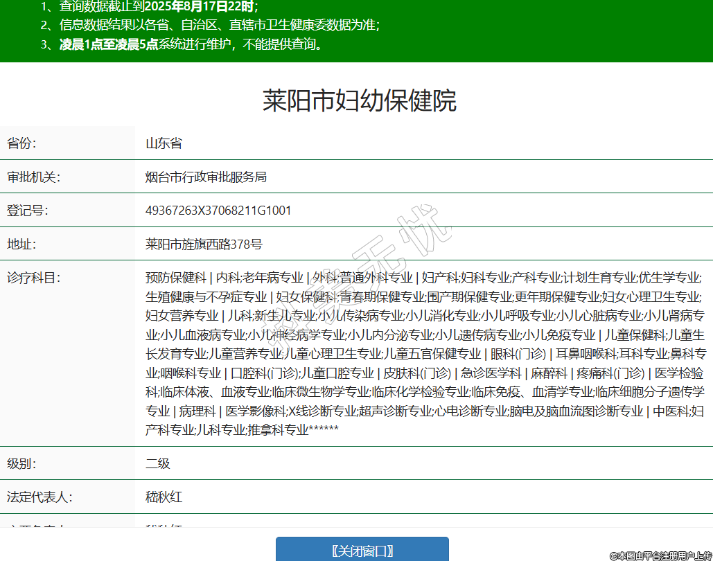 省份:山東省審批機關:煙臺市行政審批服務局登記號:49367263X37068211G1001地址:萊陽市旌旗西路378號診療科目:預防保健科 | 內科;老年病專業(yè) | 外科;普通外科專業(yè) | 婦產科;婦科專業(yè);產科專業(yè);計劃生育專業(yè);優(yōu)生學專業(yè);生殖健康與不孕癥專業(yè) | 婦女保健科;青春期保健專業(yè);圍產期保健專業(yè);更年期保健專業(yè);婦女心理衛(wèi)生專業(yè);婦女營養(yǎng)專業(yè) | 兒科;新生兒專業(yè);小兒傳染病專業(yè);小兒消化專業(yè);小兒呼吸專業(yè);小兒心臟病專業(yè);小兒腎病專業(yè);小兒血液病專業(yè);小兒神經病學專業(yè);小兒內分泌專業(yè);小兒遺傳病專業(yè);小兒免疫專業(yè) | 兒童保健科;兒童生長發(fā)育專業(yè);兒童營養(yǎng)專業(yè);兒童心理衛(wèi)生專業(yè);兒童五官保健專業(yè) | 眼科(門診) | 耳鼻咽喉科;耳科專業(yè);鼻科專業(yè);咽喉科專業(yè) | 口腔科(門診);兒童口腔專業(yè) | 皮膚科(門診) | 急診醫(yī)學科 | 麻醉科 | 疼痛科(門診) | 醫(yī)學檢驗科;臨床體液、血液專業(yè);臨床微生物學專業(yè);臨床化學檢驗專業(yè);臨床免疫、血清學專業(yè);臨床細胞分子遺傳學專業(yè) | 病理科 | 醫(yī)學影像科;X線診斷專業(yè);超聲診斷專業(yè);心電診斷專業(yè);腦電及腦血流圖診斷專業(yè) | 中醫(yī)科;婦產科專業(yè);兒科專業(yè);推拿科專業(yè)******級別:二級法定代表人:嵇秋紅主要負責人:嵇秋紅執(zhí)業(yè)許可證有效期:2025/03/13 -至- 2034/12/31 -