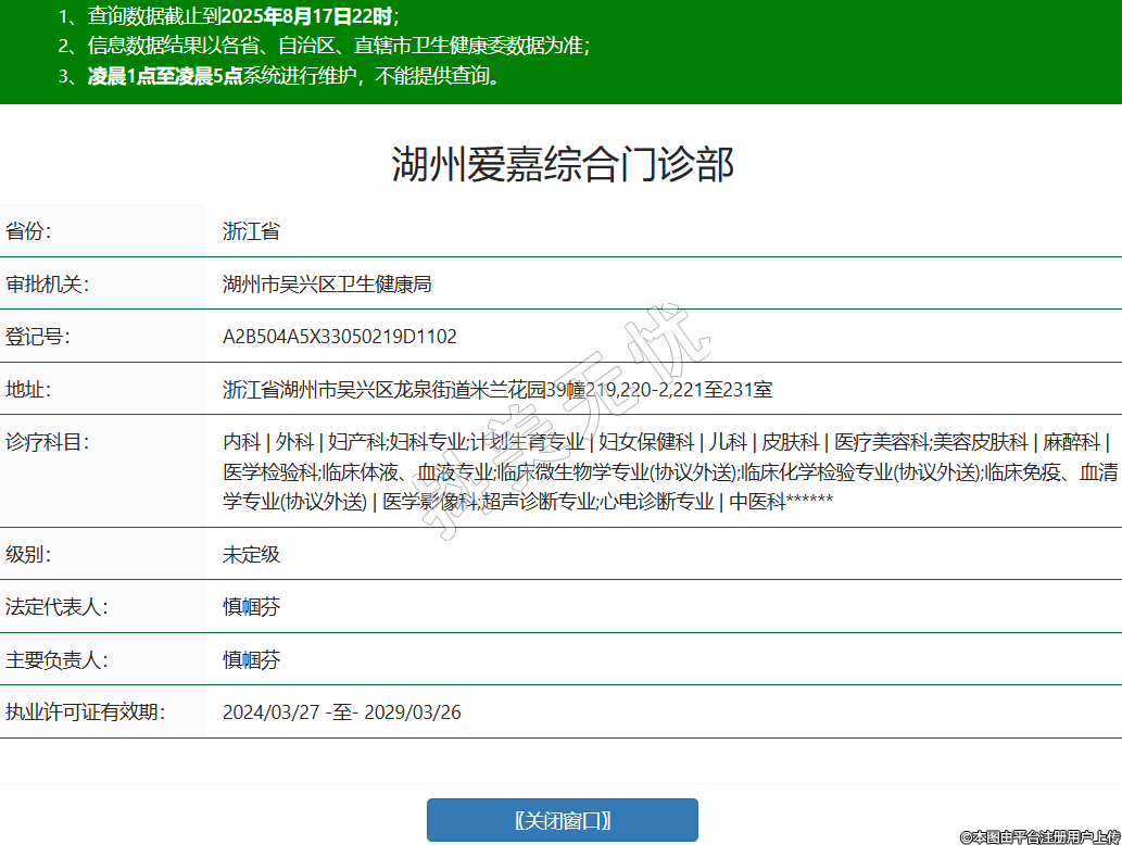 湖州愛嘉綜合門診部,診療科目:內(nèi)科 | 外科 | 婦產(chǎn)科;婦科專業(yè);計(jì)劃生育專業(yè) | 婦女保健科 | 兒科 | 皮膚科 | 醫(yī)療美容科;美容皮膚科 | 麻醉科 | 醫(yī)學(xué)檢驗(yàn)科;臨床體液、血液專業(yè);臨床微生物學(xué)專業(yè)(協(xié)議外送);臨床化學(xué)檢驗(yàn)專業(yè)(協(xié)議外送);臨床免疫、血清學(xué)專業(yè)(協(xié)議外送) | 醫(yī)學(xué)影像科;超聲診斷專業(yè);心電診斷專業(yè) | 中醫(yī)科******