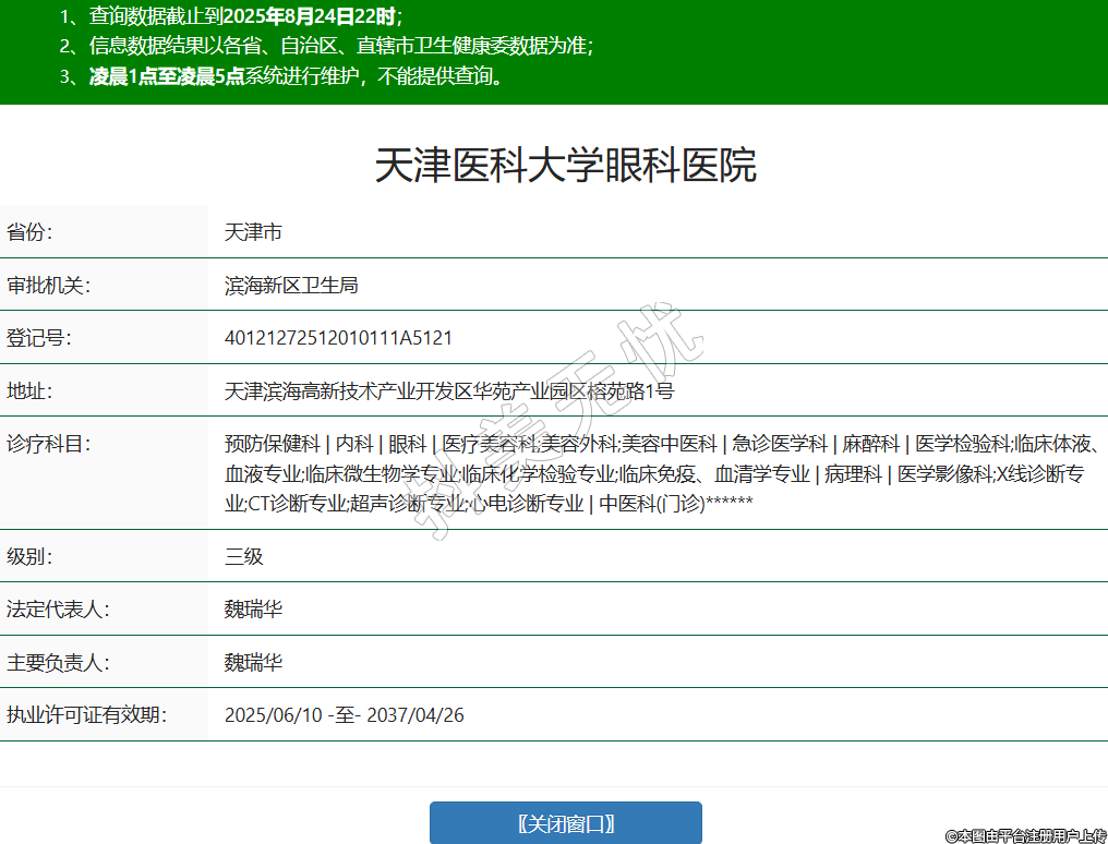 省份:天津市審批機關(guān):濱海新區(qū)衛(wèi)生局登記號:40121272512010111A5121地址:天津濱海高新技術(shù)產(chǎn)業(yè)開發(fā)區(qū)華苑產(chǎn)業(yè)園區(qū)榕苑路1號診療科目:預(yù)防保健科 | 內(nèi)科 | 眼科 | 醫(yī)療美容科;美容外科;美容中醫(yī)科 | 急診醫(yī)學(xué)科 | 麻醉科 | 醫(yī)學(xué)檢驗科;臨床體液、血液專業(yè);臨床微生物學(xué)專業(yè);臨床化學(xué)檢驗專業(yè);臨床免疫、血清學(xué)專業(yè) | 病理科 | 醫(yī)學(xué)影像科;X線診斷專業(yè);CT診斷專業(yè);超聲診斷專業(yè);心電診斷專業(yè) | 中醫(yī)科(門診)******級別:三級法定代表人:魏瑞華主要負責(zé)人:魏瑞華執(zhí)業(yè)許可證有效期:2025/06/10 -至- 2037/04/26 -