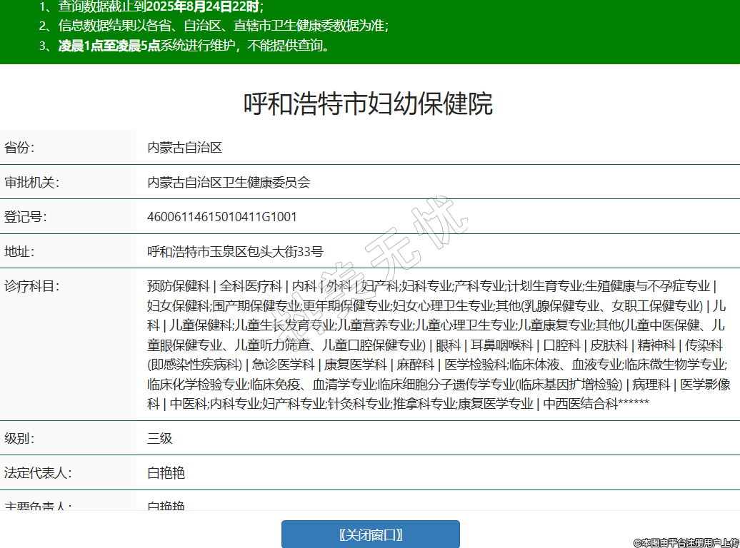 省份:內(nèi)蒙古自治區(qū)審批機(jī)關(guān):內(nèi)蒙古自治區(qū)衛(wèi)生健康委員會(huì)登記號(hào):46006114615010411G1001地址:呼和浩特市玉泉區(qū)包頭大街33號(hào)診療科目:預(yù)防保健科 | 全科醫(yī)療科 | 內(nèi)科 | 外科 | 婦產(chǎn)科;婦科專業(yè);產(chǎn)科專業(yè);計(jì)劃生育專業(yè);生殖健康與不孕癥專業(yè) | 婦女保健科;圍產(chǎn)期保健專業(yè);更年期保健專業(yè);婦女心理衛(wèi)生專業(yè);其他(乳腺保健專業(yè)、女職工保健專業(yè)) | 兒科 | 兒童保健科;兒童生長(zhǎng)發(fā)育專業(yè);兒童營(yíng)養(yǎng)專業(yè);兒童心理衛(wèi)生專業(yè);兒童康復(fù)專業(yè);其他(兒童中醫(yī)保健、兒童眼保健專業(yè)、兒童聽(tīng)力篩查、兒童口腔保健專業(yè)) | 眼科 | 耳鼻咽喉科 | 口腔科 | 皮膚科 | 精神科 | 傳染科(即感染性疾病科) | 急診醫(yī)學(xué)科 | 康復(fù)醫(yī)學(xué)科 | 麻醉科 | 醫(yī)學(xué)檢驗(yàn)科;臨床體液、血液專業(yè);臨床微生物學(xué)專業(yè);臨床化學(xué)檢驗(yàn)專業(yè);臨床免疫、血清學(xué)專業(yè);臨床細(xì)胞分子遺傳學(xué)專業(yè)(臨床基因擴(kuò)增檢驗(yàn)) | 病理科 | 醫(yī)學(xué)影像科 | 中醫(yī)科;內(nèi)科專業(yè);婦產(chǎn)科專業(yè);針灸科專業(yè);推拿科專業(yè);康復(fù)醫(yī)學(xué)專業(yè) | 中西醫(yī)結(jié)合科******級(jí)別:三級(jí)法定代表人:白艷艷主要負(fù)責(zé)人:白艷艷執(zhí)業(yè)許可證有效期:2024/11/19 -至- 2036/10/07 -