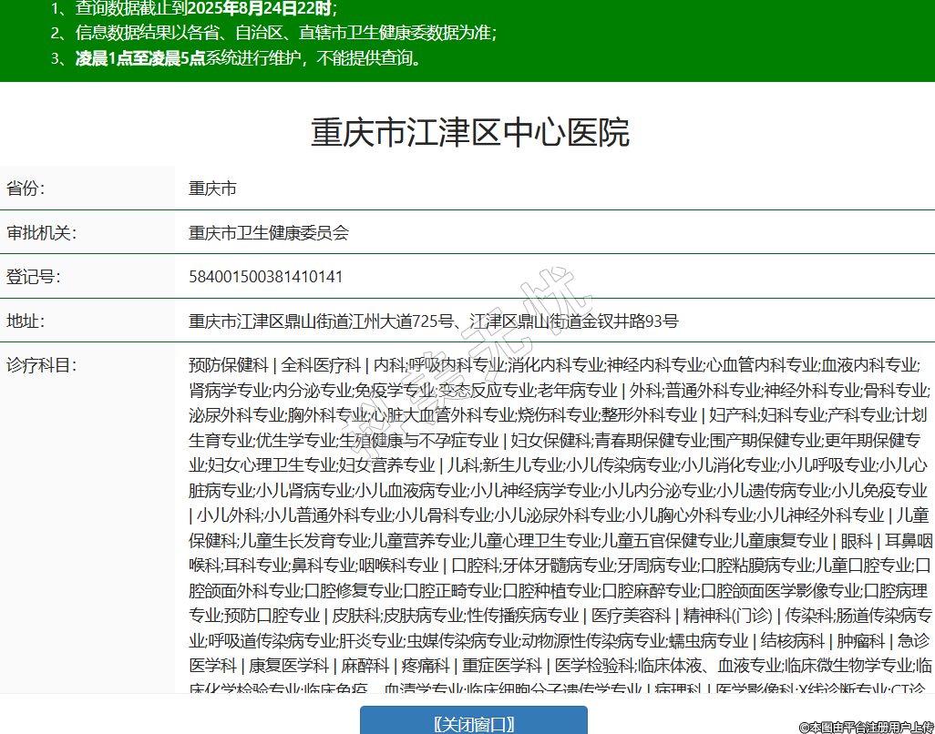省份:重慶市審批機關:重慶市衛(wèi)生健康委員會登記號:584001500381410141地址:重慶市江津區(qū)鼎山街道江州大道725號、江津區(qū)鼎山街道金釵井路93號診療科目:預防保健科 | 全科醫(yī)療科 | 內(nèi)科;呼吸內(nèi)科專業(yè);消化內(nèi)科專業(yè);神經(jīng)內(nèi)科專業(yè);心血管內(nèi)科專業(yè);血液內(nèi)科專業(yè);腎病學專業(yè);內(nèi)分泌專業(yè);免疫學專業(yè);變態(tài)反應專業(yè);老年病專業(yè) | 外科;普通外科專業(yè);神經(jīng)外科專業(yè);骨科專業(yè);泌尿外科專業(yè);胸外科專業(yè);心臟大血管外科專業(yè);燒傷科專業(yè);整形外科專業(yè) | 婦產(chǎn)科;婦科專業(yè);產(chǎn)科專業(yè);計劃生育專業(yè);優(yōu)生學專業(yè);生殖健康與不孕癥專業(yè) | 婦女保健科;青春期保健專業(yè);圍產(chǎn)期保健專業(yè);更年期保健專業(yè);婦女心理衛(wèi)生專業(yè);婦女營養(yǎng)專業(yè) | 兒科;新生兒專業(yè);小兒傳染病專業(yè);小兒消化專業(yè);小兒呼吸專業(yè);小兒心臟病專業(yè);小兒腎病專業(yè);小兒血液病專業(yè);小兒神經(jīng)病學專業(yè);小兒內(nèi)分泌專業(yè);小兒遺傳病專業(yè);小兒免疫專業(yè) | 小兒外科;小兒普通外科專業(yè);小兒骨科專業(yè);小兒泌尿外科專業(yè);小兒胸心外科專業(yè);小兒神經(jīng)外科專業(yè) | 兒童保健科;兒童生長發(fā)育專業(yè);兒童營養(yǎng)專業(yè);兒童心理衛(wèi)生專業(yè);兒童五官保健專業(yè);兒童康復專業(yè) | 眼科 | 耳鼻咽喉科;耳科專業(yè);鼻科專業(yè);咽喉科專業(yè) | 口腔科;牙體牙髓病專業(yè);牙周病專業(yè);口腔粘膜病專業(yè);兒童口腔專業(yè);口腔頜面外科專業(yè);口腔修復專業(yè);口腔正畸專業(yè);口腔種植專業(yè);口腔麻醉專業(yè);口腔頜面醫(yī)學影像專業(yè);口腔病理專業(yè);預防口腔專業(yè) | 皮膚科;皮膚病專業(yè);性傳播疾病專業(yè) | 醫(yī)療美容科 | 精神科(門診) | 傳染科;腸道傳染病專業(yè);呼吸道傳染病專業(yè);肝炎專業(yè);蟲媒傳染病專業(yè);動物源性傳染病專業(yè);蠕蟲病專業(yè) | 結核病科 | 腫瘤科 | 急診醫(yī)學科 | 康復醫(yī)學科 | 麻醉科 | 疼痛科 | 重癥醫(yī)學科 | 醫(yī)學檢驗科;臨床體液、血液專業(yè);臨床微生物學專業(yè);臨床化學檢驗專業(yè);臨床免疫、血清學專業(yè);臨床細胞分子遺傳學專業(yè) | 病理科 | 醫(yī)學影像科;X線診斷專業(yè);CT診斷專業(yè);磁共振成像診斷專業(yè);核醫(yī)學專業(yè);超聲診斷專業(yè);心電診斷專業(yè);腦電及腦血流圖診斷專業(yè);神經(jīng)肌肉電圖專業(yè);介入放射學專業(yè);放射治療專業(yè) | 中醫(yī)科;內(nèi)科專業(yè);外科專業(yè);婦產(chǎn)科專業(yè);兒科專業(yè);皮膚科專業(yè);眼科專業(yè);耳鼻咽喉科專業(yè);口腔科專業(yè);腫瘤科專業(yè);骨傷科專業(yè);肛腸科專業(yè);老年病科專業(yè);針灸科專業(yè);推拿科專業(yè);康復醫(yī)學專業(yè);急診科專業(yè);預防保健科專業(yè) | 中西醫(yī)結合科******級別:三級法定代表人:金顯蓉主要負責人:金顯蓉執(zhí)業(yè)許可證有效期:2017/05/18 -至- 2032/05/17 -