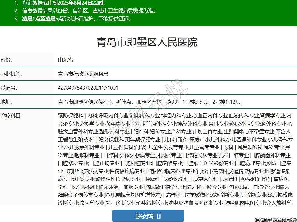 省份:山東省審批機(jī)關(guān):青島市行政審批服務(wù)局登記號(hào):42784075437028211A1001地址:青島市即墨區(qū)健民街4號(hào),延伸點(diǎn):即墨區(qū)石林三路38號(hào)1號(hào)樓2-5層、2號(hào)樓1-12層診療科目:預(yù)防保健科 | 內(nèi)科;呼吸內(nèi)科專業(yè);消化內(nèi)科專業(yè);神經(jīng)內(nèi)科專業(yè);心血管內(nèi)科專業(yè);血液內(nèi)科專業(yè);腎病學(xué)專業(yè);內(nèi)分泌專業(yè);免疫學(xué)專業(yè);老年病專業(yè) | 外科;普通外科專業(yè);神經(jīng)外科專業(yè);骨科專業(yè);泌尿外科專業(yè);胸外科專業(yè);心臟大血管外科專業(yè);整形外科專業(yè) | 婦產(chǎn)科;婦科專業(yè);產(chǎn)科專業(yè);計(jì)劃生育專業(yè);生殖健康與不孕癥專業(yè)(不含人工輔助生殖技術(shù)) | 婦女保健科;更年期保健專業(yè) | 兒科(門診+病房) | 小兒外科;小兒普通外科專業(yè);小兒骨科專業(yè);小兒泌尿外科專業(yè) | 兒童保健科(門診);兒童生長發(fā)育專業(yè);兒童營養(yǎng)專業(yè) | 眼科 | 耳鼻咽喉科;耳科專業(yè);鼻科專業(yè);咽喉科專業(yè) | 口腔科;牙體牙髓病專業(yè);牙周病專業(yè);口腔粘膜病專業(yè);兒童口腔專業(yè);口腔頜面外科專業(yè);口腔修復(fù)專業(yè);口腔正畸專業(yè);口腔種植專業(yè);口腔麻醉專業(yè);口腔頜面醫(yī)學(xué)影像專業(yè);口腔病理專業(yè);預(yù)防口腔專業(yè) | 皮膚科;皮膚病專業(yè);性傳播疾病專業(yè) | 精神科;臨床心理專業(yè)(門診) | 傳染科;腸道傳染病專業(yè);呼吸道傳染病專業(yè);肝炎專業(yè);動(dòng)物源性傳染病專業(yè) | 腫瘤科 | 急診醫(yī)學(xué)科 | 康復(fù)醫(yī)學(xué)科 | 麻醉科 | 疼痛科(門診) | 重癥醫(yī)學(xué)科 | 醫(yī)學(xué)檢驗(yàn)科;臨床體液、血液專業(yè);臨床微生物學(xué)專業(yè);臨床化學(xué)檢驗(yàn)專業(yè);臨床免疫、血清學(xué)專業(yè);臨床細(xì)胞分子遺傳學(xué)專業(yè)(限開展臨床基因擴(kuò)增技術(shù)) | 病理科 | 醫(yī)學(xué)影像科;X線診斷專業(yè);CT診斷專業(yè);磁共振成像診斷專業(yè);核醫(yī)學(xué)專業(yè);超聲診斷專業(yè);心電診斷專業(yè);腦電及腦血流圖診斷專業(yè);神經(jīng)肌肉電圖專業(yè);介入放射學(xué)專業(yè);放射治療專業(yè) | 中醫(yī)科;內(nèi)科專業(yè);外科專業(yè);婦產(chǎn)科專業(yè);骨傷科專業(yè);肛腸科專業(yè);針灸科專業(yè);推拿科專業(yè);康復(fù)醫(yī)學(xué)專業(yè)******級(jí)別:三級(jí)法定代表人:姜尊平主要負(fù)責(zé)人:宋啟京執(zhí)業(yè)許可證有效期:2018/09/19 -至- 2031/06/23 -