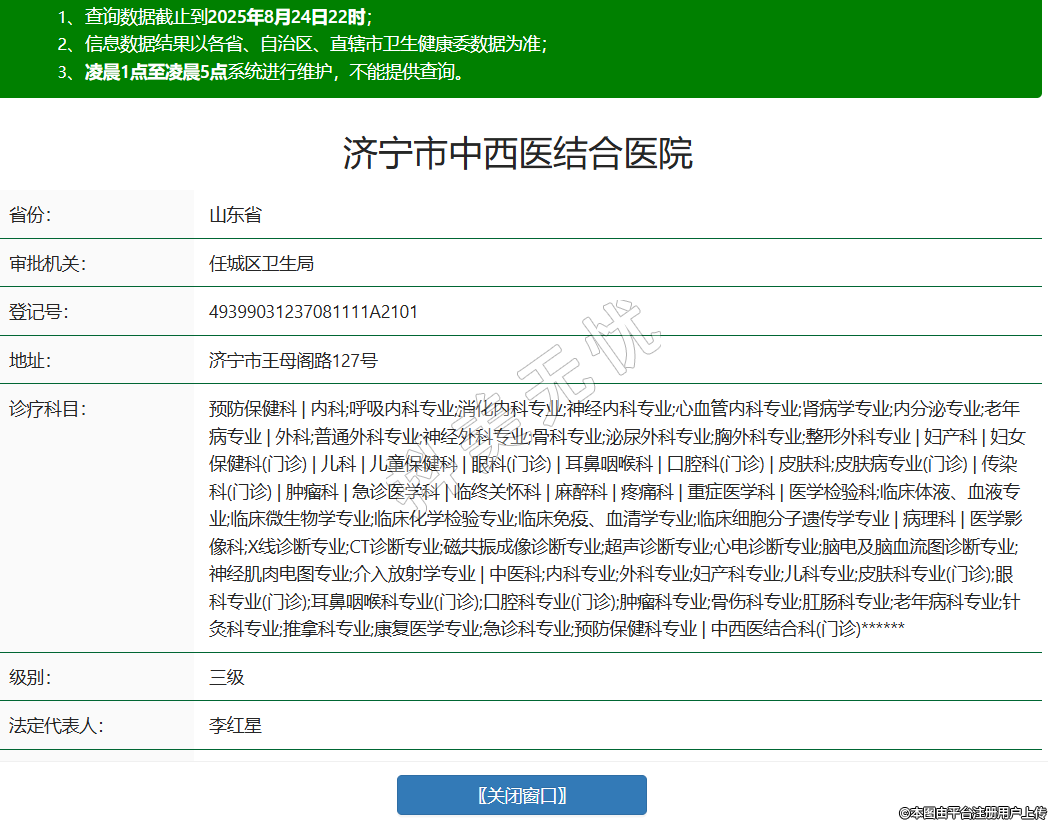 省份:山東省審批機關:任城區(qū)衛(wèi)生局登記號:49399031237081111A2101地址:濟寧市王母閣路127號診療科目:預防保健科 | 內科;呼吸內科專業(yè);消化內科專業(yè);神經(jīng)內科專業(yè);心血管內科專業(yè);腎病學專業(yè);內分泌專業(yè);老年病專業(yè) | 外科;普通外科專業(yè);神經(jīng)外科專業(yè);骨科專業(yè);泌尿外科專業(yè);胸外科專業(yè);整形外科專業(yè) | 婦產(chǎn)科 | 婦女保健科(門診) | 兒科 | 兒童保健科 | 眼科(門診) | 耳鼻咽喉科 | 口腔科(門診) | 皮膚科;皮膚病專業(yè)(門診) | 傳染科(門診) | 腫瘤科 | 急診醫(yī)學科 | 臨終關懷科 | 麻醉科 | 疼痛科 | 重癥醫(yī)學科 | 醫(yī)學檢驗科;臨床體液、血液專業(yè);臨床微生物學專業(yè);臨床化學檢驗專業(yè);臨床免疫、血清學專業(yè);臨床細胞分子遺傳學專業(yè) | 病理科 | 醫(yī)學影像科;X線診斷專業(yè);CT診斷專業(yè);磁共振成像診斷專業(yè);超聲診斷專業(yè);心電診斷專業(yè);腦電及腦血流圖診斷專業(yè);神經(jīng)肌肉電圖專業(yè);介入放射學專業(yè) | 中醫(yī)科;內科專業(yè);外科專業(yè);婦產(chǎn)科專業(yè);兒科專業(yè);皮膚科專業(yè)(門診);眼科專業(yè)(門診);耳鼻咽喉科專業(yè)(門診);口腔科專業(yè)(門診);腫瘤科專業(yè);骨傷科專業(yè);肛腸科專業(yè);老年病科專業(yè);針灸科專業(yè);推拿科專業(yè);康復醫(yī)學專業(yè);急診科專業(yè);預防保健科專業(yè) | 中西醫(yī)結合科(門診)******級別:三級法定代表人:李紅星主要負責人:李紅星執(zhí)業(yè)許可證有效期:2025/08/12 -至- 2028/12/31 -