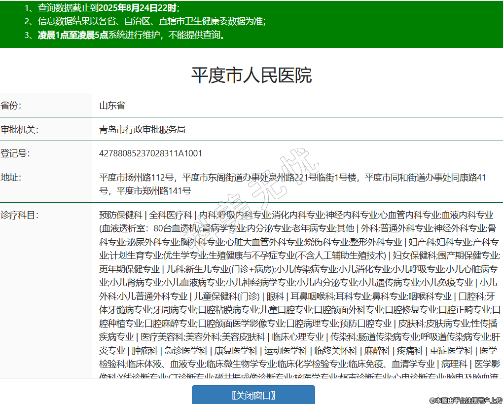 省份:山東省審批機關(guān):青島市行政審批服務(wù)局登記號:42788085237028311A1001地址:平度市揚州路112號,平度市東閣街道辦事處泉州路221號臨街1號樓,平度市同和街道辦事處同康路41號,平度市鄭州路141號診療科目:預(yù)防保健科 | 全科醫(yī)療科 | 內(nèi)科;呼吸內(nèi)科專業(yè);消化內(nèi)科專業(yè);神經(jīng)內(nèi)科專業(yè);心血管內(nèi)科專業(yè);血液內(nèi)科專業(yè)(血液透析室:80臺血透機);腎病學(xué)專業(yè);內(nèi)分泌專業(yè);老年病專業(yè);其他 | 外科;普通外科專業(yè);神經(jīng)外科專業(yè);骨科專業(yè);泌尿外科專業(yè);胸外科專業(yè);心臟大血管外科專業(yè);燒傷科專業(yè);整形外科專業(yè) | 婦產(chǎn)科;婦科專業(yè);產(chǎn)科專業(yè);計劃生育專業(yè);優(yōu)生學(xué)專業(yè);生殖健康與不孕癥專業(yè)(不含人工輔助生殖技術(shù)) | 婦女保健科;圍產(chǎn)期保健專業(yè);更年期保健專業(yè) | 兒科;新生兒專業(yè)(門診+病房);小兒傳染病專業(yè);小兒消化專業(yè);小兒呼吸專業(yè);小兒心臟病專業(yè);小兒腎病專業(yè);小兒血液病專業(yè);小兒神經(jīng)病學(xué)專業(yè);小兒內(nèi)分泌專業(yè);小兒遺傳病專業(yè);小兒免疫專業(yè) | 小兒外科;小兒普通外科專業(yè) | 兒童保健科(門診) | 眼科 | 耳鼻咽喉科;耳科專業(yè);鼻科專業(yè);咽喉科專業(yè) | 口腔科;牙體牙髓病專業(yè);牙周病專業(yè);口腔粘膜病專業(yè);兒童口腔專業(yè);口腔頜面外科專業(yè);口腔修復(fù)專業(yè);口腔正畸專業(yè);口腔種植專業(yè);口腔麻醉專業(yè);口腔頜面醫(yī)學(xué)影像專業(yè);口腔病理專業(yè);預(yù)防口腔專業(yè) | 皮膚科;皮膚病專業(yè);性傳播疾病專業(yè) | 醫(yī)療美容科;美容外科;美容皮膚科 | 臨床心理專業(yè) | 傳染科;腸道傳染病專業(yè);呼吸道傳染病專業(yè);肝炎專業(yè) | 腫瘤科 | 急診醫(yī)學(xué)科 | 康復(fù)醫(yī)學(xué)科 | 運動醫(yī)學(xué)科 | 臨終關(guān)懷科 | 麻醉科 | 疼痛科 | 重癥醫(yī)學(xué)科 | 醫(yī)學(xué)檢驗科;臨床體液、血液專業(yè);臨床微生物學(xué)專業(yè);臨床化學(xué)檢驗專業(yè);臨床免疫、血清學(xué)專業(yè) | 病理科 | 醫(yī)學(xué)影像科;X線診斷專業(yè);CT診斷專業(yè);磁共振成像診斷專業(yè);核醫(yī)學(xué)專業(yè);超聲診斷專業(yè);心電診斷專業(yè);腦電及腦血流圖診斷專業(yè);神經(jīng)肌肉電圖專業(yè);介入放射學(xué)專業(yè);放射治療專業(yè) | 中醫(yī)科;內(nèi)科專業(yè);皮膚科專業(yè)(門診);針灸科專業(yè);推拿科專業(yè) | 中西醫(yī)結(jié)合科******級別:三級法定代表人:李成職主要負責(zé)人:李成職執(zhí)業(yè)許可證有效期:2017/06/22 -至- 2028/10/21 -