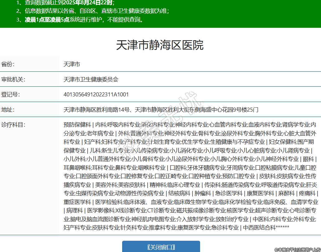 省份:天津市審批機(jī)關(guān):天津市衛(wèi)生健康委員會登記號:40130564912022311A1001地址:天津市靜海區(qū)勝利南路14號、天津市靜海區(qū)勝利大街東側(cè)海盛中心花園9號樓25門診療科目:預(yù)防保健科 | 內(nèi)科;呼吸內(nèi)科專業(yè);消化內(nèi)科專業(yè);神經(jīng)內(nèi)科專業(yè);心血管內(nèi)科專業(yè);血液內(nèi)科專業(yè);腎病學(xué)專業(yè);內(nèi)分泌專業(yè);老年病專業(yè) | 外科;普通外科專業(yè);神經(jīng)外科專業(yè);骨科專業(yè);泌尿外科專業(yè);胸外科專業(yè);心臟大血管外科專業(yè) | 婦產(chǎn)科;婦科專業(yè);產(chǎn)科專業(yè);計劃生育專業(yè);優(yōu)生學(xué)專業(yè);生殖健康與不孕癥專業(yè) | 婦女保健科;圍產(chǎn)期保健專業(yè) | 兒科;新生兒專業(yè);小兒傳染病專業(yè);小兒消化專業(yè);小兒呼吸專業(yè);小兒心臟病專業(yè);小兒腎病專業(yè) | 小兒外科;小兒普通外科專業(yè);小兒骨科專業(yè);小兒泌尿外科專業(yè);小兒胸心外科專業(yè);小兒神經(jīng)外科專業(yè) | 眼科 | 耳鼻咽喉科;耳科專業(yè);鼻科專業(yè);咽喉科專業(yè) | 口腔科;牙體牙髓病專業(yè);牙周病專業(yè);口腔粘膜病專業(yè);兒童口腔專業(yè);口腔頜面外科專業(yè);口腔修復(fù)專業(yè);口腔正畸專業(yè);口腔種植專業(yè);預(yù)防口腔專業(yè) | 皮膚科;皮膚病專業(yè);性傳播疾病專業(yè) | 美容外科;美容皮膚科 | 精神科;臨床心理專業(yè) | 傳染科;腸道傳染病專業(yè);呼吸道傳染病專業(yè);肝炎專業(yè);蟲媒傳染病專業(yè);動物源性傳染病專業(yè) | 結(jié)核病科 | 腫瘤科 | 急診醫(yī)學(xué)科 | 康復(fù)醫(yī)學(xué)科 | 麻醉科 | 疼痛科 | 重癥醫(yī)學(xué)科 | 醫(yī)學(xué)檢驗科;臨床體液、血液專業(yè);臨床微生物學(xué)專業(yè);臨床化學(xué)檢驗專業(yè);臨床免疫、血清學(xué)專業(yè) | 病理科 | 醫(yī)學(xué)影像科;X線診斷專業(yè);CT診斷專業(yè);磁共振成像診斷專業(yè);核醫(yī)學(xué)專業(yè);超聲診斷專業(yè);心電診斷專業(yè);腦電及腦血流圖診斷專業(yè);神經(jīng)肌肉電圖專業(yè);介入放射學(xué)專業(yè);放射治療專業(yè) | 中醫(yī)科;內(nèi)科專業(yè);外科專業(yè);婦產(chǎn)科專業(yè);皮膚科專業(yè);針灸科專業(yè);推拿科專業(yè);康復(fù)醫(yī)學(xué)專業(yè);急診科專業(yè) | 中西醫(yī)結(jié)合科******級別:三級法定代表人:樊凌華主要負(fù)責(zé)人:樊凌華執(zhí)業(yè)許可證有效期:2017/06/17 -至- 2032/06/16 -