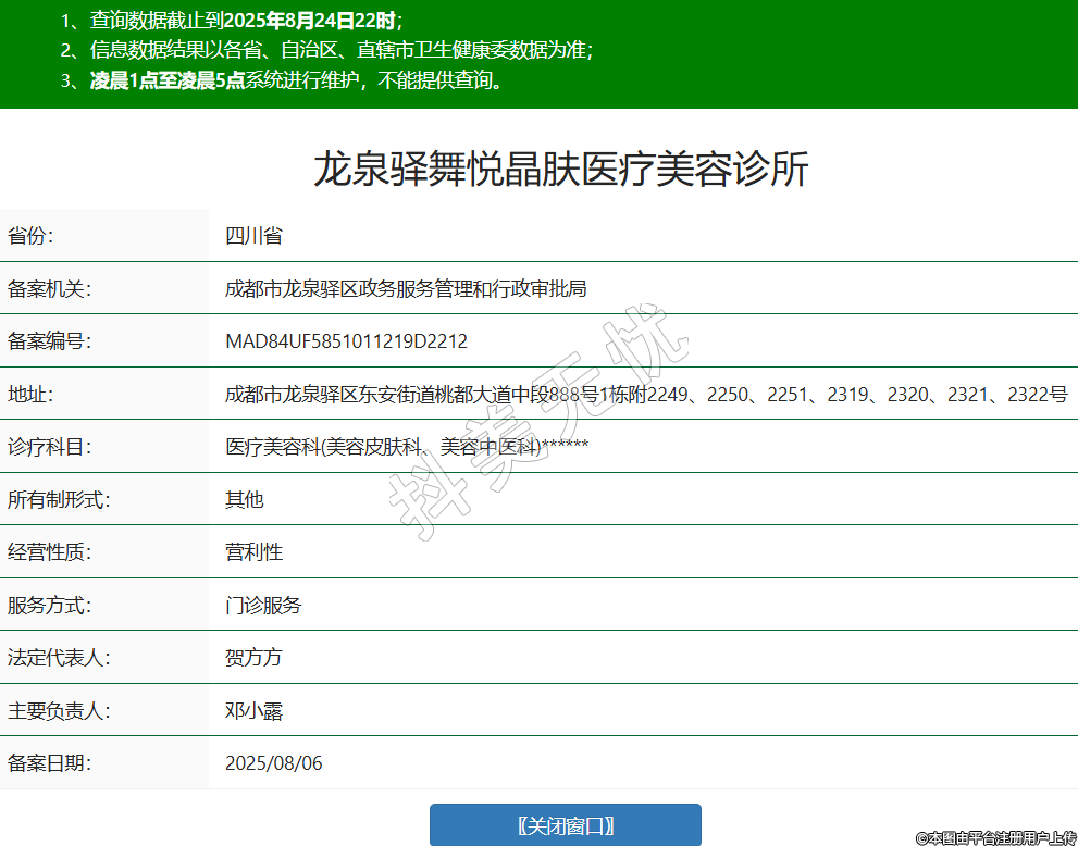 省份:四川省備案機(jī)關(guān):成都市龍泉驛區(qū)政務(wù)服務(wù)管理和行政審批局備案編號:MAD84UF5851011219D2212地址:成都市龍泉驛區(qū)東安街道桃都大道中段888號1棟附2249、2250、2251、2319、2320、2321、2322號診療科目:醫(yī)療美容科(美容皮膚科、美容中醫(yī)科)******所有制形式:其他經(jīng)營性質(zhì):營利性服務(wù)方式:門診服務(wù)法定代表人:賀方方主要負(fù)責(zé)人:鄧小露備案日期:2025/08/06 -