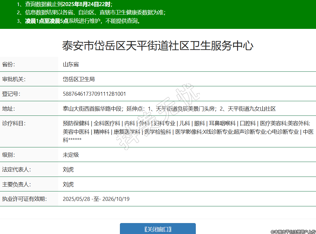 省份:山東省審批機(jī)關(guān):岱岳區(qū)衛(wèi)生局登記號:58876461737091112B1001地址:泰山大街西首振華路中段;延伸點(diǎn):1、天平街道良辰美景門頭房;2、天平街道九女山社區(qū)診療科目:預(yù)防保健科 | 全科醫(yī)療科 | 內(nèi)科 | 外科 | 婦科專業(yè) | 兒科 | 眼科 | 耳鼻咽喉科 | 口腔科 | 醫(yī)療美容科;美容外科;美容中醫(yī)科 | 精神科 | 康復(fù)醫(yī)學(xué)科 | 醫(yī)學(xué)檢驗(yàn)科 | 醫(yī)學(xué)影像科;X線診斷專業(yè);超聲診斷專業(yè);心電診斷專業(yè) | 中醫(yī)科******級別:未定級法定代表人:劉虎主要負(fù)責(zé)人:劉虎執(zhí)業(yè)許可證有效期:2025/05/28 -至- 2026/10/19 -