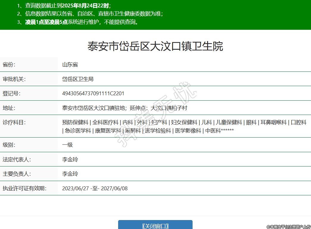 省份:山東省審批機(jī)關(guān):岱岳區(qū)衛(wèi)生局登記號(hào):49430564737091111C2201地址:泰安市岱岳區(qū)大汶口鎮(zhèn)駐地;延伸點(diǎn):大汶口鎮(zhèn)柏子村診療科目:預(yù)防保健科 | 全科醫(yī)療科 | 內(nèi)科 | 外科 | 婦產(chǎn)科 | 婦女保健科 | 兒科 | 兒童保健科 | 眼科 | 耳鼻咽喉科 | 口腔科 | 急診醫(yī)學(xué)科 | 康復(fù)醫(yī)學(xué)科 | 麻醉科 | 醫(yī)學(xué)檢驗(yàn)科 | 醫(yī)學(xué)影像科 | 中醫(yī)科******級(jí)別:一級(jí)法定代表人:李金玲主要負(fù)責(zé)人:李金玲執(zhí)業(yè)許可證有效期:2023/06/27 -至- 2027/06/08 -