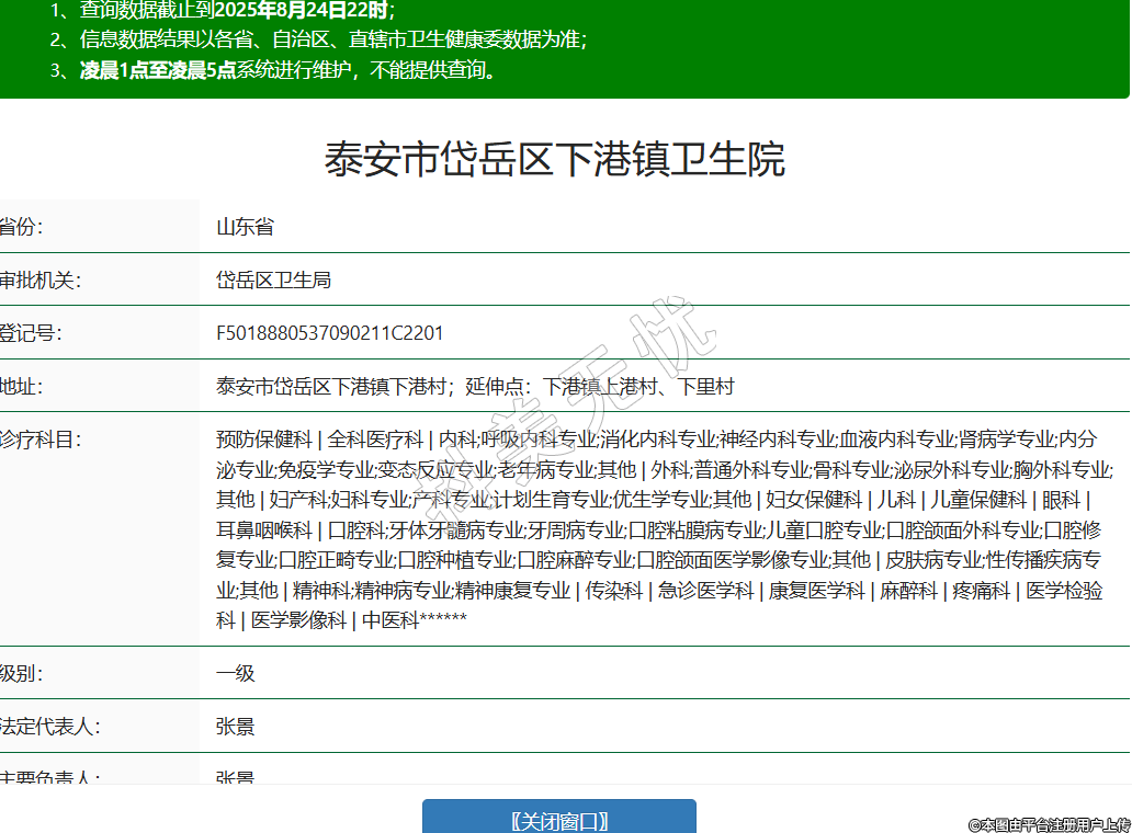 省份:山東省審批機關:岱岳區(qū)衛(wèi)生局登記號:F5018880537090211C2201地址:泰安市岱岳區(qū)下港鎮(zhèn)下港村;延伸點:下港鎮(zhèn)上港村、下里村診療科目:預防保健科 | 全科醫(yī)療科 | 內科;呼吸內科專業(yè);消化內科專業(yè);神經內科專業(yè);血液內科專業(yè);腎病學專業(yè);內分泌專業(yè);免疫學專業(yè);變態(tài)反應專業(yè);老年病專業(yè);其他 | 外科;普通外科專業(yè);骨科專業(yè);泌尿外科專業(yè);胸外科專業(yè);其他 | 婦產科;婦科專業(yè);產科專業(yè);計劃生育專業(yè);優(yōu)生學專業(yè);其他 | 婦女保健科 | 兒科 | 兒童保健科 | 眼科 | 耳鼻咽喉科 | 口腔科;牙體牙髓病專業(yè);牙周病專業(yè);口腔粘膜病專業(yè);兒童口腔專業(yè);口腔頜面外科專業(yè);口腔修復專業(yè);口腔正畸專業(yè);口腔種植專業(yè);口腔麻醉專業(yè);口腔頜面醫(yī)學影像專業(yè);其他 | 皮膚病專業(yè);性傳播疾病專業(yè);其他 | 精神科;精神病專業(yè);精神康復專業(yè) | 傳染科 | 急診醫(yī)學科 | 康復醫(yī)學科 | 麻醉科 | 疼痛科 | 醫(yī)學檢驗科 | 醫(yī)學影像科 | 中醫(yī)科******級別:一級法定代表人:張景主要負責人:張景執(zhí)業(yè)許可證有效期:2024/11/11 -至- 2026/07/06 -