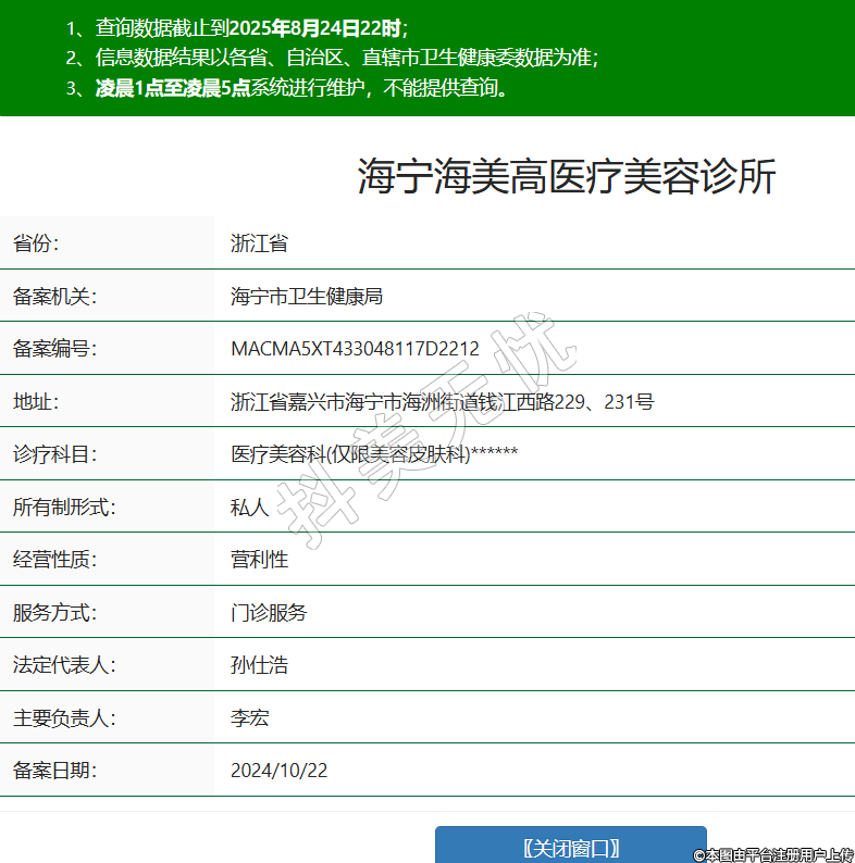 省份:浙江省備案機關:海寧市衛(wèi)生健康局備案編號:MACMA5XT433048117D2212地址:浙江省嘉興市海寧市海洲街道錢江西路229、231號診療科目:醫(yī)療美容科(僅限美容皮膚科)******所有制形式:私人經營性質:營利性服務方式:門診服務法定代表人:孫仕浩主要負責人:李宏備案日期:2024/10/22 -