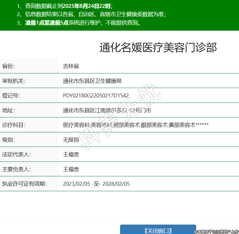 省份:吉林省審批機(jī)關(guān):通化市東昌區(qū)衛(wèi)生健康局登記號:PDY02180G22050217D1542地址:通化市東昌區(qū)江南波爾多22-12號門市診療科目:醫(yī)療美容科;美容外科;眉部美容術(shù);眼部美容術(shù);鼻部美容術(shù)******級別:無級別法定代表人:王福貴主要負(fù)責(zé)人:王福貴執(zhí)業(yè)許可證有效期:2023/02/05 -至- 2028/02/05 -