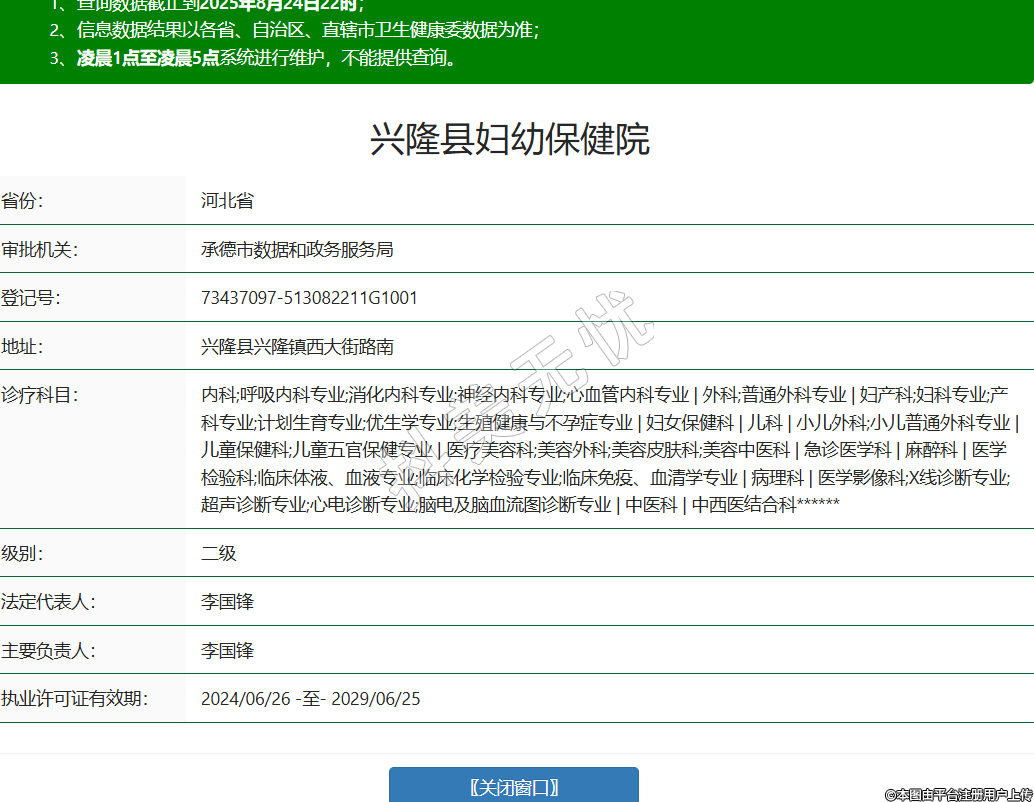 省份:河北省審批機(jī)關(guān):承德市數(shù)據(jù)和政務(wù)服務(wù)局登記號:73437097-513082211G1001地址:興隆縣興隆鎮(zhèn)西大街路南診療科目:內(nèi)科;呼吸內(nèi)科專業(yè);消化內(nèi)科專業(yè);神經(jīng)內(nèi)科專業(yè);心血管內(nèi)科專業(yè) | 外科;普通外科專業(yè) | 婦產(chǎn)科;婦科專業(yè);產(chǎn)科專業(yè);計劃生育專業(yè);優(yōu)生學(xué)專業(yè);生殖健康與不孕癥專業(yè) | 婦女保健科 | 兒科 | 小兒外科;小兒普通外科專業(yè) | 兒童保健科;兒童五官保健專業(yè) | 醫(yī)療美容科;美容外科;美容皮膚科;美容中醫(yī)科 | 急診醫(yī)學(xué)科 | 麻醉科 | 醫(yī)學(xué)檢驗科;臨床體液、血液專業(yè);臨床化學(xué)檢驗專業(yè);臨床免疫、血清學(xué)專業(yè) | 病理科 | 醫(yī)學(xué)影像科;X線診斷專業(yè);超聲診斷專業(yè);心電診斷專業(yè);腦電及腦血流圖診斷專業(yè) | 中醫(yī)科 | 中西醫(yī)結(jié)合科******級別:二級法定代表人:李國鋒主要負(fù)責(zé)人:李國鋒執(zhí)業(yè)許可證有效期:2024/06/26 -至- 2029/06/25 -