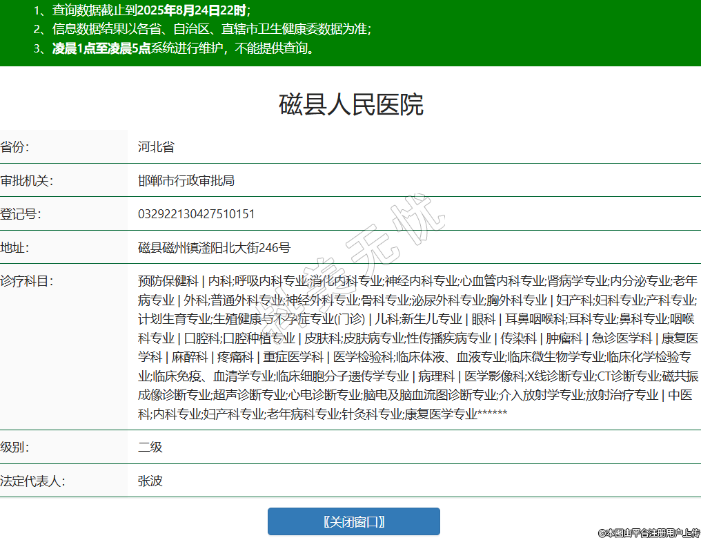 省份:河北省審批機(jī)關(guān):邯鄲市行政審批局登記號(hào):032922130427510151地址:磁縣磁州鎮(zhèn)滏陽北大街246號(hào)診療科目:預(yù)防保健科 | 內(nèi)科;呼吸內(nèi)科專業(yè);消化內(nèi)科專業(yè);神經(jīng)內(nèi)科專業(yè);心血管內(nèi)科專業(yè);腎病學(xué)專業(yè);內(nèi)分泌專業(yè);老年病專業(yè) | 外科;普通外科專業(yè);神經(jīng)外科專業(yè);骨科專業(yè);泌尿外科專業(yè);胸外科專業(yè) | 婦產(chǎn)科;婦科專業(yè);產(chǎn)科專業(yè);計(jì)劃生育專業(yè);生殖健康與不孕癥專業(yè)(門診) | 兒科;新生兒專業(yè) | 眼科 | 耳鼻咽喉科;耳科專業(yè);鼻科專業(yè);咽喉科專業(yè) | 口腔科;口腔種植專業(yè) | 皮膚科;皮膚病專業(yè);性傳播疾病專業(yè) | 傳染科 | 腫瘤科 | 急診醫(yī)學(xué)科 | 康復(fù)醫(yī)學(xué)科 | 麻醉科 | 疼痛科 | 重癥醫(yī)學(xué)科 | 醫(yī)學(xué)檢驗(yàn)科;臨床體液、血液專業(yè);臨床微生物學(xué)專業(yè);臨床化學(xué)檢驗(yàn)專業(yè);臨床免疫、血清學(xué)專業(yè);臨床細(xì)胞分子遺傳學(xué)專業(yè) | 病理科 | 醫(yī)學(xué)影像科;X線診斷專業(yè);CT診斷專業(yè);磁共振成像診斷專業(yè);超聲診斷專業(yè);心電診斷專業(yè);腦電及腦血流圖診斷專業(yè);介入放射學(xué)專業(yè);放射治療專業(yè) | 中醫(yī)科;內(nèi)科專業(yè);婦產(chǎn)科專業(yè);老年病科專業(yè);針灸科專業(yè);康復(fù)醫(yī)學(xué)專業(yè)******級(jí)別:二級(jí)法定代表人:張波主要負(fù)責(zé)人:張波執(zhí)業(yè)許可證有效期:2015/05/15 -至- 2030/05/15 -