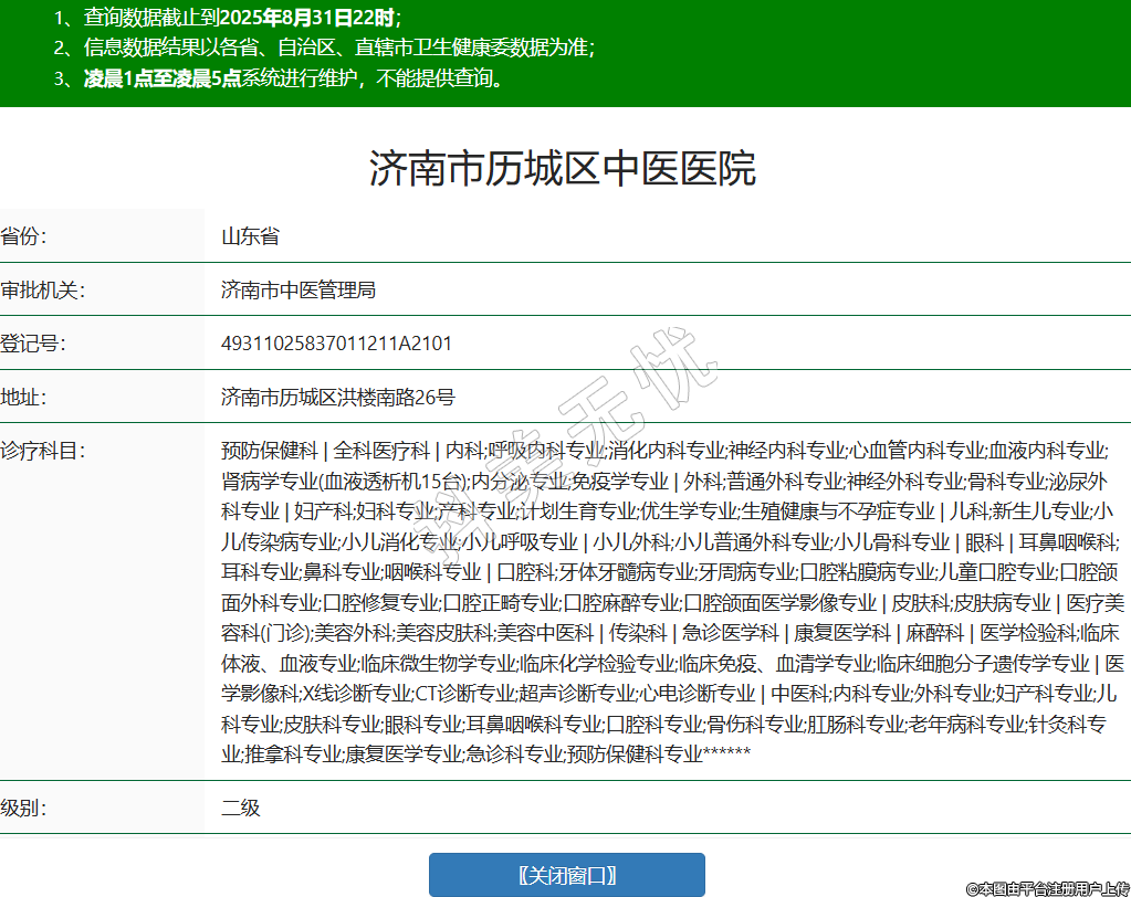 省份:山東省審批機關(guān):濟南市中醫(yī)管理局登記號:49311025837011211A2101地址:濟南市歷城區(qū)洪樓南路26號診療科目:預(yù)防保健科 | 全科醫(yī)療科 | 內(nèi)科;呼吸內(nèi)科專業(yè);消化內(nèi)科專業(yè);神經(jīng)內(nèi)科專業(yè);心血管內(nèi)科專業(yè);血液內(nèi)科專業(yè);腎病學(xué)專業(yè)(血液透析機15臺);內(nèi)分泌專業(yè);免疫學(xué)專業(yè) | 外科;普通外科專業(yè);神經(jīng)外科專業(yè);骨科專業(yè);泌尿外科專業(yè) | 婦產(chǎn)科;婦科專業(yè);產(chǎn)科專業(yè);計劃生育專業(yè);優(yōu)生學(xué)專業(yè);生殖健康與不孕癥專業(yè) | 兒科;新生兒專業(yè);小兒傳染病專業(yè);小兒消化專業(yè);小兒呼吸專業(yè) | 小兒外科;小兒普通外科專業(yè);小兒骨科專業(yè) | 眼科 | 耳鼻咽喉科;耳科專業(yè);鼻科專業(yè);咽喉科專業(yè) | 口腔科;牙體牙髓病專業(yè);牙周病專業(yè);口腔粘膜病專業(yè);兒童口腔專業(yè);口腔頜面外科專業(yè);口腔修復(fù)專業(yè);口腔正畸專業(yè);口腔麻醉專業(yè);口腔頜面醫(yī)學(xué)影像專業(yè) | 皮膚科;皮膚病專業(yè) | 醫(yī)療美容科(門診);美容外科;美容皮膚科;美容中醫(yī)科 | 傳染科 | 急診醫(yī)學(xué)科 | 康復(fù)醫(yī)學(xué)科 | 麻醉科 | 醫(yī)學(xué)檢驗科;臨床體液、血液專業(yè);臨床微生物學(xué)專業(yè);臨床化學(xué)檢驗專業(yè);臨床免疫、血清學(xué)專業(yè);臨床細胞分子遺傳學(xué)專業(yè) | 醫(yī)學(xué)影像科;X線診斷專業(yè);CT診斷專業(yè);超聲診斷專業(yè);心電診斷專業(yè) | 中醫(yī)科;內(nèi)科專業(yè);外科專業(yè);婦產(chǎn)科專業(yè);兒科專業(yè);皮膚科專業(yè);眼科專業(yè);耳鼻咽喉科專業(yè);口腔科專業(yè);骨傷科專業(yè);肛腸科專業(yè);老年病科專業(yè);針灸科專業(yè);推拿科專業(yè);康復(fù)醫(yī)學(xué)專業(yè);急診科專業(yè);預(yù)防保健科專業(yè)******級別:二級法定代表人:張苗苗主要負責(zé)人:張苗苗執(zhí)業(yè)許可證有效期:2025/07/14 -至- 2039/04/08 -