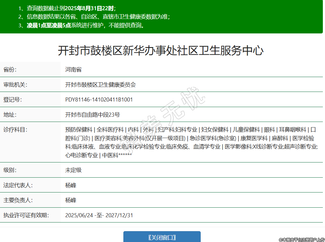 省份:河南省審批機關:開封市鼓樓區(qū)衛(wèi)生健康委員會登記號:PDY81146-141020411B1001地址:開封市自由路中段23號診療科目:預防保健科 | 全科醫(yī)療科 | 內科 | 外科 | 婦產科;婦科專業(yè) | 婦女保健科 | 兒童保健科 | 眼科 | 耳鼻咽喉科 | 口腔科(門診) | 醫(yī)療美容科;美容外科(僅開展一級項目) | 急診醫(yī)學科(急診室) | 康復醫(yī)學科 | 麻醉科 | 醫(yī)學檢驗科;臨床體液、血液專業(yè);臨床化學檢驗專業(yè);臨床免疫、血清學專業(yè) | 醫(yī)學影像科;X線診斷專業(yè);超聲診斷專業(yè);心電診斷專業(yè) | 中醫(yī)科******級別:未定級法定代表人:楊峰主要負責人:楊峰執(zhí)業(yè)許可證有效期:2025/06/24 -至- 2027/12/31 -