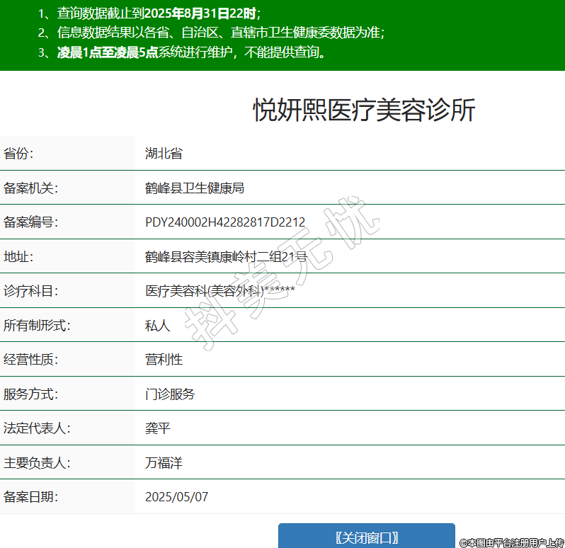 省份:湖北省備案機關(guān):鶴峰縣衛(wèi)生健康局備案編號:PDY240002H42282817D2212地址:鶴峰縣容美鎮(zhèn)康嶺村二組21號診療科目:醫(yī)療美容科(美容外科)******所有制形式:私人經(jīng)營性質(zhì):營利性服務(wù)方式:門診服務(wù)法定代表人:龔平主要負責(zé)人:萬福洋備案日期:2025/05/07 -
