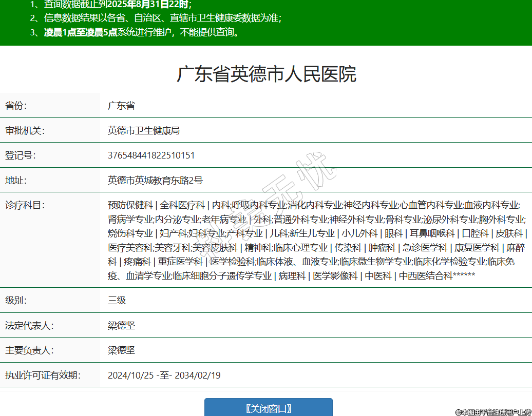 省份:廣東省審批機關(guān):英德市衛(wèi)生健康局登記號:376548441822510151地址:英德市英城教育東路2號診療科目:預(yù)防保健科 | 全科醫(yī)療科 | 內(nèi)科;呼吸內(nèi)科專業(yè);消化內(nèi)科專業(yè);神經(jīng)內(nèi)科專業(yè);心血管內(nèi)科專業(yè);血液內(nèi)科專業(yè);腎病學(xué)專業(yè);內(nèi)分泌專業(yè);老年病專業(yè) | 外科;普通外科專業(yè);神經(jīng)外科專業(yè);骨科專業(yè);泌尿外科專業(yè);胸外科專業(yè);燒傷科專業(yè) | 婦產(chǎn)科;婦科專業(yè);產(chǎn)科專業(yè) | 兒科;新生兒專業(yè) | 小兒外科 | 眼科 | 耳鼻咽喉科 | 口腔科 | 皮膚科 | 醫(yī)療美容科;美容牙科;美容皮膚科 | 精神科;臨床心理專業(yè) | 傳染科 | 腫瘤科 | 急診醫(yī)學(xué)科 | 康復(fù)醫(yī)學(xué)科 | 麻醉科 | 疼痛科 | 重癥醫(yī)學(xué)科 | 醫(yī)學(xué)檢驗科;臨床體液、血液專業(yè);臨床微生物學(xué)專業(yè);臨床化學(xué)檢驗專業(yè);臨床免疫、血清學(xué)專業(yè);臨床細(xì)胞分子遺傳學(xué)專業(yè) | 病理科 | 醫(yī)學(xué)影像科 | 中醫(yī)科 | 中西醫(yī)結(jié)合科******級別:三級法定代表人:梁德堅主要負(fù)責(zé)人:梁德堅執(zhí)業(yè)許可證有效期:2024/10/25 -至- 2034/02/19 -