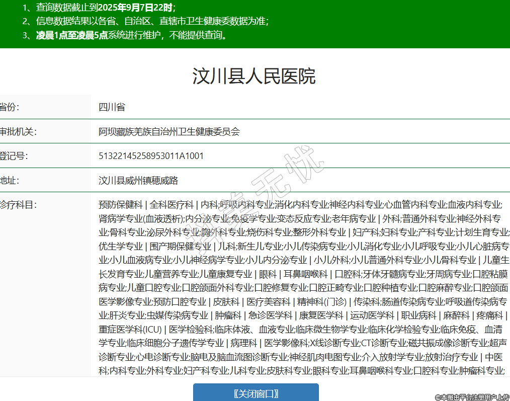省份:四川省審批機(jī)關(guān):阿壩藏族羌族自治州衛(wèi)生健康委員會(huì)登記號(hào):51322145258953011A1001地址:汶川縣威州鎮(zhèn)穂威路診療科目:預(yù)防保健科 | 全科醫(yī)療科 | 內(nèi)科;呼吸內(nèi)科專(zhuān)業(yè);消化內(nèi)科專(zhuān)業(yè);神經(jīng)內(nèi)科專(zhuān)業(yè);心血管內(nèi)科專(zhuān)業(yè);血液內(nèi)科專(zhuān)業(yè);腎病學(xué)專(zhuān)業(yè)(血液透析);內(nèi)分泌專(zhuān)業(yè);免疫學(xué)專(zhuān)業(yè);變態(tài)反應(yīng)專(zhuān)業(yè);老年病專(zhuān)業(yè) | 外科;普通外科專(zhuān)業(yè);神經(jīng)外科專(zhuān)業(yè);骨科專(zhuān)業(yè);泌尿外科專(zhuān)業(yè);胸外科專(zhuān)業(yè);燒傷科專(zhuān)業(yè);整形外科專(zhuān)業(yè) | 婦產(chǎn)科;婦科專(zhuān)業(yè);產(chǎn)科專(zhuān)業(yè);計(jì)劃生育專(zhuān)業(yè);優(yōu)生學(xué)專(zhuān)業(yè) | 圍產(chǎn)期保健專(zhuān)業(yè) | 兒科;新生兒專(zhuān)業(yè);小兒傳染病專(zhuān)業(yè);小兒消化專(zhuān)業(yè);小兒呼吸專(zhuān)業(yè);小兒心臟病專(zhuān)業(yè);小兒血液病專(zhuān)業(yè);小兒神經(jīng)病學(xué)專(zhuān)業(yè);小兒內(nèi)分泌專(zhuān)業(yè) | 小兒外科;小兒普通外科專(zhuān)業(yè);小兒骨科專(zhuān)業(yè) | 兒童生長(zhǎng)發(fā)育專(zhuān)業(yè);兒童營(yíng)養(yǎng)專(zhuān)業(yè);兒童康復(fù)專(zhuān)業(yè) | 眼科 | 耳鼻咽喉科 | 口腔科;牙體牙髓病專(zhuān)業(yè);牙周病專(zhuān)業(yè);口腔粘膜病專(zhuān)業(yè);兒童口腔專(zhuān)業(yè);口腔頜面外科專(zhuān)業(yè);口腔修復(fù)專(zhuān)業(yè);口腔正畸專(zhuān)業(yè);口腔種植專(zhuān)業(yè);口腔麻醉專(zhuān)業(yè);口腔頜面醫(yī)學(xué)影像專(zhuān)業(yè);預(yù)防口腔專(zhuān)業(yè) | 皮膚科 | 醫(yī)療美容科 | 精神科(門(mén)診) | 傳染科;腸道傳染病專(zhuān)業(yè);呼吸道傳染病專(zhuān)業(yè);肝炎專(zhuān)業(yè);蟲(chóng)媒傳染病專(zhuān)業(yè) | 腫瘤科 | 急診醫(yī)學(xué)科 | 康復(fù)醫(yī)學(xué)科 | 運(yùn)動(dòng)醫(yī)學(xué)科 | 職業(yè)病科 | 麻醉科 | 疼痛科 | 重癥醫(yī)學(xué)科(ICU) | 醫(yī)學(xué)檢驗(yàn)科;臨床體液、血液專(zhuān)業(yè);臨床微生物學(xué)專(zhuān)業(yè);臨床化學(xué)檢驗(yàn)專(zhuān)業(yè);臨床免疫、血清學(xué)專(zhuān)業(yè);臨床細(xì)胞分子遺傳學(xué)專(zhuān)業(yè) | 病理科 | 醫(yī)學(xué)影像科;X線診斷專(zhuān)業(yè);CT診斷專(zhuān)業(yè);磁共振成像診斷專(zhuān)業(yè);超聲診斷專(zhuān)業(yè);心電診斷專(zhuān)業(yè);腦電及腦血流圖診斷專(zhuān)業(yè);神經(jīng)肌肉電圖專(zhuān)業(yè);介入放射學(xué)專(zhuān)業(yè);放射治療專(zhuān)業(yè) | 中醫(yī)科;內(nèi)科專(zhuān)業(yè);外科專(zhuān)業(yè);婦產(chǎn)科專(zhuān)業(yè);兒科專(zhuān)業(yè);皮膚科專(zhuān)業(yè);眼科專(zhuān)業(yè);耳鼻咽喉科專(zhuān)業(yè);口腔科專(zhuān)業(yè);腫瘤科專(zhuān)業(yè);骨傷科專(zhuān)業(yè);肛腸科專(zhuān)業(yè);老年病科專(zhuān)業(yè);針灸科專(zhuān)業(yè);推拿科專(zhuān)業(yè);康復(fù)醫(yī)學(xué)專(zhuān)業(yè);預(yù)防保健科專(zhuān)業(yè) | 民族醫(yī)學(xué)科 | 中西醫(yī)結(jié)合科******級(jí)別:三級(jí)法定代表人:馮盧主要負(fù)責(zé)人:馮盧執(zhí)業(yè)許可證有效期:2023/04/25 -至- 2038/04/25 -