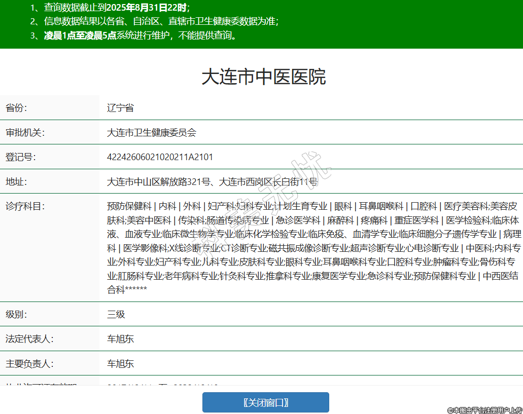 省份:遼寧省審批機(jī)關(guān):大連市衛(wèi)生健康委員會登記號:42242606021020211A2101地址:大連市中山區(qū)解放路321號、大連市西崗區(qū)長白街11號診療科目:預(yù)防保健科 | 內(nèi)科 | 外科 | 婦產(chǎn)科;婦科專業(yè);計劃生育專業(yè) | 眼科 | 耳鼻咽喉科 | 口腔科 | 醫(yī)療美容科;美容皮膚科;美容中醫(yī)科 | 傳染科;腸道傳染病專業(yè) | 急診醫(yī)學(xué)科 | 麻醉科 | 疼痛科 | 重癥醫(yī)學(xué)科 | 醫(yī)學(xué)檢驗(yàn)科;臨床體液、血液專業(yè);臨床微生物學(xué)專業(yè);臨床化學(xué)檢驗(yàn)專業(yè);臨床免疫、血清學(xué)專業(yè);臨床細(xì)胞分子遺傳學(xué)專業(yè) | 病理科 | 醫(yī)學(xué)影像科;X線診斷專業(yè);CT診斷專業(yè);磁共振成像診斷專業(yè);超聲診斷專業(yè);心電診斷專業(yè) | 中醫(yī)科;內(nèi)科專業(yè);外科專業(yè);婦產(chǎn)科專業(yè);兒科專業(yè);皮膚科專業(yè);眼科專業(yè);耳鼻咽喉科專業(yè);口腔科專業(yè);腫瘤科專業(yè);骨傷科專業(yè);肛腸科專業(yè);老年病科專業(yè);針灸科專業(yè);推拿科專業(yè);康復(fù)醫(yī)學(xué)專業(yè);急診科專業(yè);預(yù)防保健科專業(yè) | 中西醫(yī)結(jié)合科******級別:三級法定代表人:車旭東主要負(fù)責(zé)人:車旭東執(zhí)業(yè)許可證有效期:2017/12/11 -至- 2032/12/10 -