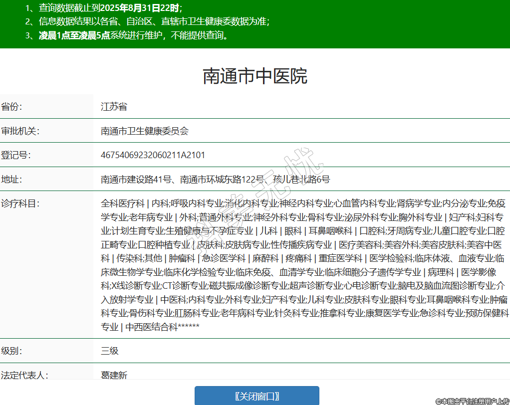省份:江蘇省審批機(jī)關(guān):南通市衛(wèi)生健康委員會(huì)登記號(hào):46754069232060211A2101地址:南通市建設(shè)路41號(hào)、南通市環(huán)城東路122號(hào)、孩兒巷北路6號(hào)診療科目:全科醫(yī)療科 | 內(nèi)科;呼吸內(nèi)科專業(yè);消化內(nèi)科專業(yè);神經(jīng)內(nèi)科專業(yè);心血管內(nèi)科專業(yè);腎病學(xué)專業(yè);內(nèi)分泌專業(yè);免疫學(xué)專業(yè);老年病專業(yè) | 外科;普通外科專業(yè);神經(jīng)外科專業(yè);骨科專業(yè);泌尿外科專業(yè);胸外科專業(yè) | 婦產(chǎn)科;婦科專業(yè);計(jì)劃生育專業(yè);生殖健康與不孕癥專業(yè) | 兒科 | 眼科 | 耳鼻咽喉科 | 口腔科;牙周病專業(yè);兒童口腔專業(yè);口腔正畸專業(yè);口腔種植專業(yè) | 皮膚科;皮膚病專業(yè);性傳播疾病專業(yè) | 醫(yī)療美容科;美容外科;美容皮膚科;美容中醫(yī)科 | 傳染科;其他 | 腫瘤科 | 急診醫(yī)學(xué)科 | 麻醉科 | 疼痛科 | 重癥醫(yī)學(xué)科 | 醫(yī)學(xué)檢驗(yàn)科;臨床體液、血液專業(yè);臨床微生物學(xué)專業(yè);臨床化學(xué)檢驗(yàn)專業(yè);臨床免疫、血清學(xué)專業(yè);臨床細(xì)胞分子遺傳學(xué)專業(yè) | 病理科 | 醫(yī)學(xué)影像科;X線診斷專業(yè);CT診斷專業(yè);磁共振成像診斷專業(yè);超聲診斷專業(yè);心電診斷專業(yè);腦電及腦血流圖診斷專業(yè);介入放射學(xué)專業(yè) | 中醫(yī)科;內(nèi)科專業(yè);外科專業(yè);婦產(chǎn)科專業(yè);兒科專業(yè);皮膚科專業(yè);眼科專業(yè);耳鼻咽喉科專業(yè);腫瘤科專業(yè);骨傷科專業(yè);肛腸科專業(yè);老年病科專業(yè);針灸科專業(yè);推拿科專業(yè);康復(fù)醫(yī)學(xué)專業(yè);急診科專業(yè);預(yù)防保健科專業(yè) | 中西醫(yī)結(jié)合科******級(jí)別:三級(jí)法定代表人:葛建新主要負(fù)責(zé)人:葛建新執(zhí)業(yè)許可證有效期:2024/12/25 -至- 2038/08/25 -