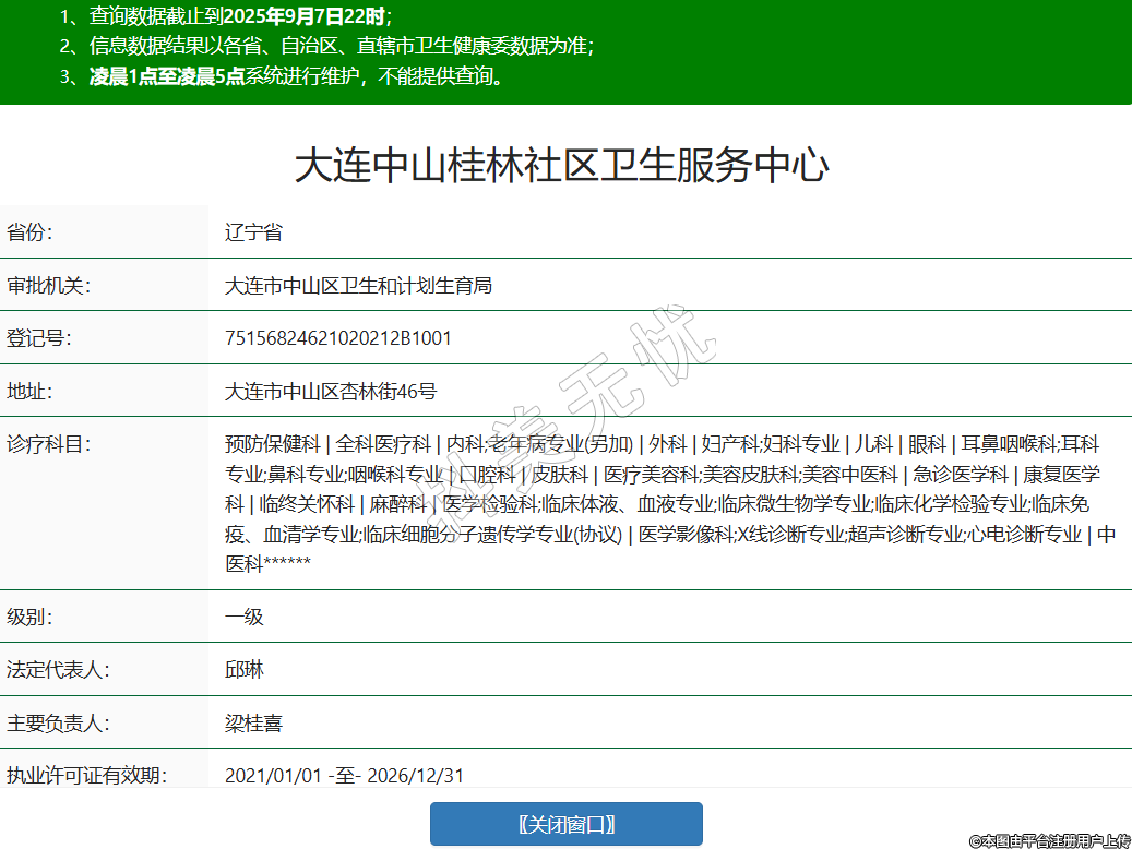 省份:遼寧省審批機關:大連市中山區(qū)衛(wèi)生和計劃生育局登記號:75156824621020212B1001地址:大連市中山區(qū)杏林街46號診療科目:預防保健科 | 全科醫(yī)療科 | 內(nèi)科;老年病專業(yè)(另加) | 外科 | 婦產(chǎn)科;婦科專業(yè) | 兒科 | 眼科 | 耳鼻咽喉科;耳科專業(yè);鼻科專業(yè);咽喉科專業(yè) | 口腔科 | 皮膚科 | 醫(yī)療美容科;美容皮膚科;美容中醫(yī)科 | 急診醫(yī)學科 | 康復醫(yī)學科 | 臨終關懷科 | 麻醉科 | 醫(yī)學檢驗科;臨床體液、血液專業(yè);臨床微生物學專業(yè);臨床化學檢驗專業(yè);臨床免疫、血清學專業(yè);臨床細胞分子遺傳學專業(yè)(協(xié)議) | 醫(yī)學影像科;X線診斷專業(yè);超聲診斷專業(yè);心電診斷專業(yè) | 中醫(yī)科******級別:一級法定代表人:邱琳主要負責人:梁桂喜執(zhí)業(yè)許可證有效期:2021/01/01 -至- 2026/12/31 -
