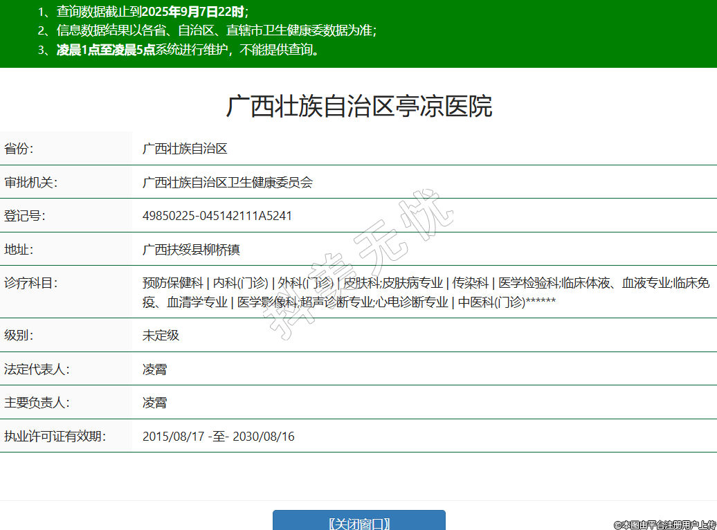 省份:廣西壯族自治區(qū)審批機(jī)關(guān):廣西壯族自治區(qū)衛(wèi)生健康委員會(huì)登記號(hào):49850225-045142111A5241地址:廣西扶綏縣柳橋鎮(zhèn)診療科目:預(yù)防保健科 | 內(nèi)科(門(mén)診) | 外科(門(mén)診) | 皮膚科;皮膚病專(zhuān)業(yè) | 傳染科 | 醫(yī)學(xué)檢驗(yàn)科;臨床體液、血液專(zhuān)業(yè);臨床免疫、血清學(xué)專(zhuān)業(yè) | 醫(yī)學(xué)影像科;超聲診斷專(zhuān)業(yè);心電診斷專(zhuān)業(yè) | 中醫(yī)科(門(mén)診)******級(jí)別:未定級(jí)法定代表人:凌霄主要負(fù)責(zé)人:凌霄執(zhí)業(yè)許可證有效期:2015/08/17 -至- 2030/08/16 -