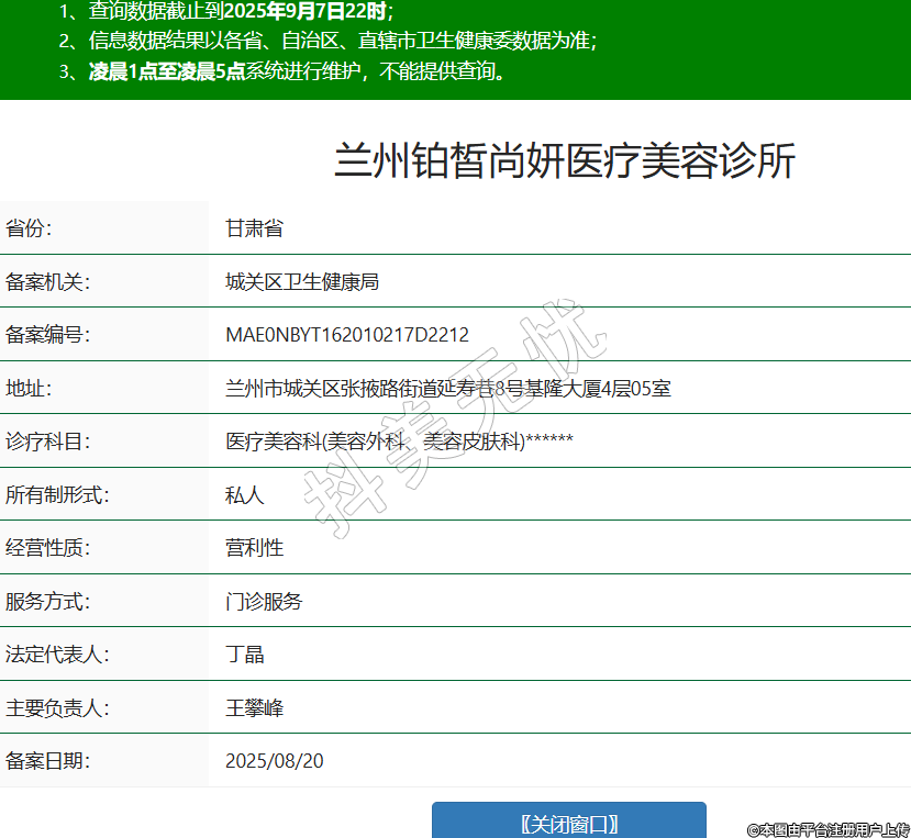 省份:甘肅省備案機關:城關區(qū)衛(wèi)生健康局備案編號:MAE0NBYT162010217D2212地址:蘭州市城關區(qū)張掖路街道延壽巷8號基隆大廈4層05室診療科目:醫(yī)療美容科(美容外科、美容皮膚科)******所有制形式:私人經(jīng)營性質(zhì):營利性服務方式:門診服務法定代表人:丁晶主要負責人:王攀峰備案日期:2025/08/20 -