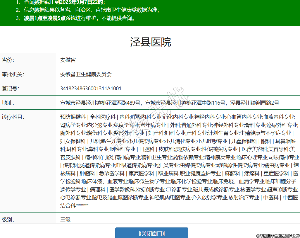 省份:安徽省審批機關(guān):安徽省衛(wèi)生健康委員會登記號:34182348636001311A1001地址:宣城市涇縣涇川鎮(zhèn)桃花潭西路489號;宣城市涇縣涇川鎮(zhèn)桃花潭中路116號,涇縣涇川鎮(zhèn)謝園路2號診療科目:預(yù)防保健科 | 全科醫(yī)療科 | 內(nèi)科;呼吸內(nèi)科專業(yè);消化內(nèi)科專業(yè);神經(jīng)內(nèi)科專業(yè);心血管內(nèi)科專業(yè);血液內(nèi)科專業(yè);腎病學(xué)專業(yè);內(nèi)分泌專業(yè);免疫學(xué)專業(yè);老年病專業(yè) | 外科;普通外科專業(yè);神經(jīng)外科專業(yè);骨科專業(yè);泌尿外科專業(yè);胸外科專業(yè);燒傷科專業(yè);整形外科專業(yè) | 婦產(chǎn)科;婦科專業(yè);產(chǎn)科專業(yè);計劃生育專業(yè);生殖健康與不孕癥專業(yè) | 婦女保健科 | 兒科;新生兒專業(yè);小兒傳染病專業(yè);小兒消化專業(yè);小兒呼吸專業(yè) | 兒童保健科 | 眼科 | 耳鼻咽喉科;耳科專業(yè);鼻科專業(yè);咽喉科專業(yè) | 口腔科 | 皮膚科;皮膚病專業(yè);性傳播疾病專業(yè) | 醫(yī)療美容科;美容牙科;美容皮膚科 | 精神科(門診);精神病專業(yè);精神衛(wèi)生專業(yè);藥物依賴專業(yè);精神康復(fù)專業(yè);臨床心理專業(yè);司法精神專業(yè) | 傳染科;腸道傳染病專業(yè);呼吸道傳染病專業(yè);肝炎專業(yè);蟲媒傳染病專業(yè);動物源性傳染病專業(yè);蠕蟲病專業(yè) | 結(jié)核病科 | 腫瘤科 | 急診醫(yī)學(xué)科 | 康復(fù)醫(yī)學(xué)科 | 職業(yè)病科;職業(yè)健康監(jiān)護專業(yè) | 麻醉科 | 疼痛科 | 重癥醫(yī)學(xué)科 | 醫(yī)學(xué)檢驗科;臨床體液、血液專業(yè);臨床微生物學(xué)專業(yè);臨床化學(xué)檢驗專業(yè);臨床免疫、血清學(xué)專業(yè);臨床細(xì)胞分子遺傳學(xué)專業(yè) | 病理科 | 醫(yī)學(xué)影像科;X線診斷專業(yè);CT診斷專業(yè);磁共振成像診斷專業(yè);核醫(yī)學(xué)專業(yè);超聲診斷專業(yè);心電診斷專業(yè);腦電及腦血流圖診斷專業(yè);神經(jīng)肌肉電圖專業(yè);介入放射學(xué)專業(yè);放射治療專業(yè) | 中醫(yī)科 | 中西醫(yī)結(jié)合科******級別:三級法定代表人:潘志剛主要負(fù)責(zé)人:潘志剛執(zhí)業(yè)許可證有效期:2023/11/17 -至- 2035/11/11 -