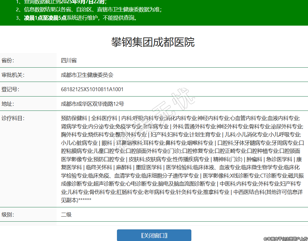 省份:四川省審批機(jī)關(guān):成都市衛(wèi)生健康委員會登記號:68182125X51010811A1001地址:成都市成華區(qū)雙華南路12號診療科目:預(yù)防保健科 | 全科醫(yī)療科 | 內(nèi)科;呼吸內(nèi)科專業(yè);消化內(nèi)科專業(yè);神經(jīng)內(nèi)科專業(yè);心血管內(nèi)科專業(yè);血液內(nèi)科專業(yè);腎病學(xué)專業(yè);內(nèi)分泌專業(yè);免疫學(xué)專業(yè);老年病專業(yè) | 外科;普通外科專業(yè);神經(jīng)外科專業(yè);骨科專業(yè);泌尿外科專業(yè);胸外科專業(yè);燒傷科專業(yè);整形外科專業(yè) | 婦產(chǎn)科;婦科專業(yè);計(jì)劃生育專業(yè) | 兒科;小兒消化專業(yè);小兒呼吸專業(yè);小兒心臟病專業(yè) | 眼科 | 耳鼻咽喉科;耳科專業(yè);鼻科專業(yè);咽喉科專業(yè) | 口腔科;牙體牙髓病專業(yè);牙周病專業(yè);口腔粘膜病專業(yè);兒童口腔專業(yè);口腔頜面外科專業(yè)(門診);口腔修復(fù)專業(yè);口腔正畸專業(yè);口腔種植專業(yè);口腔頜面醫(yī)學(xué)影像專業(yè);預(yù)防口腔專業(yè) | 皮膚科;皮膚病專業(yè);性傳播疾病專業(yè) | 精神科(門診) | 腫瘤科 | 急診醫(yī)學(xué)科 | 康復(fù)醫(yī)學(xué)科 | 臨終關(guān)懷科 | 麻醉科 | 重癥醫(yī)學(xué)科 | 醫(yī)學(xué)檢驗(yàn)科;臨床體液、血液專業(yè);臨床微生物學(xué)專業(yè);臨床化學(xué)檢驗(yàn)專業(yè);臨床免疫、血清學(xué)專業(yè);臨床細(xì)胞分子遺傳學(xué)專業(yè) | 醫(yī)學(xué)影像科;X線診斷專業(yè);CT診斷專業(yè);磁共振成像診斷專業(yè);超聲診斷專業(yè);心電診斷專業(yè);腦電及腦血流圖診斷專業(yè) | 中醫(yī)科;內(nèi)科專業(yè);外科專業(yè);婦產(chǎn)科專業(yè);兒科專業(yè);骨傷科專業(yè);肛腸科專業(yè);老年病科專業(yè);針灸科專業(yè);推拿科專業(yè) | 中西醫(yī)結(jié)合科(其他許可信息詳見副本)******級別:二級法定代表人:余生源主要負(fù)責(zé)人:余生源執(zhí)業(yè)許可證有效期:2021/07/06 -至- 2028/01/11 -