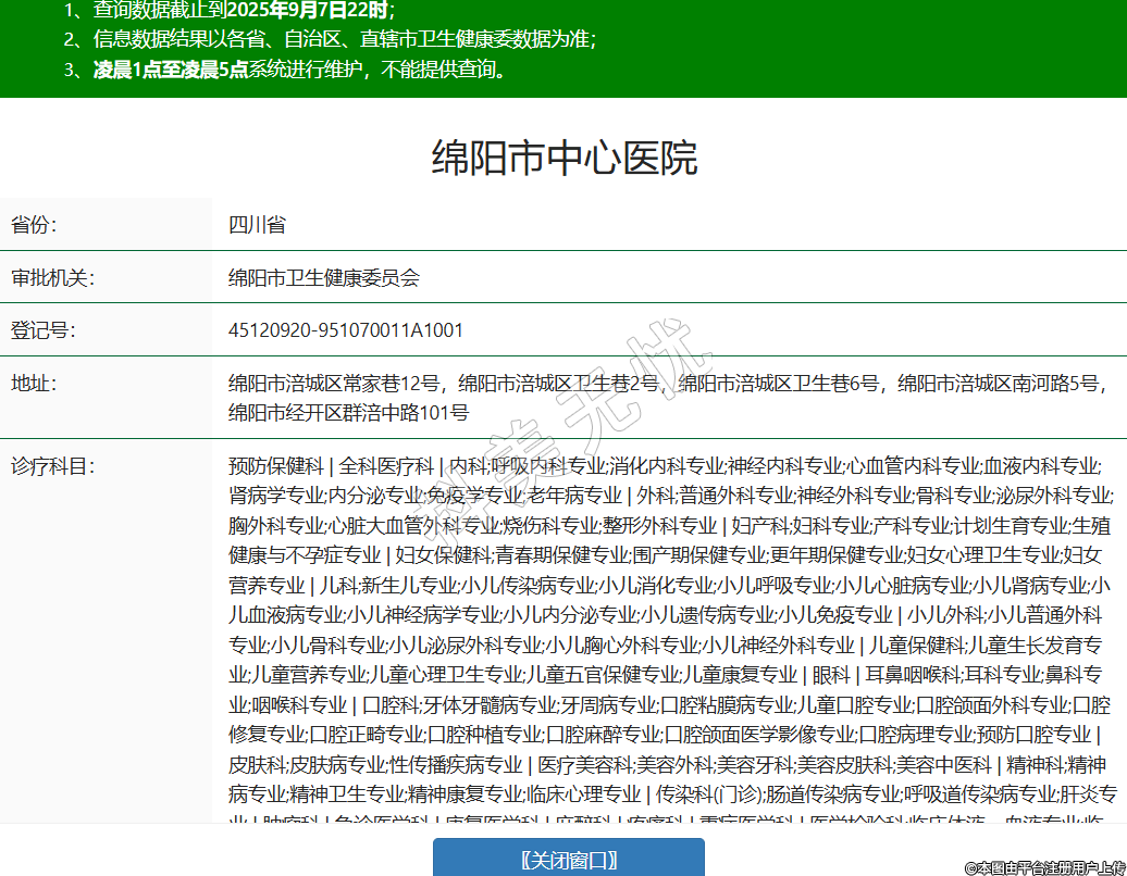 省份:四川省審批機關:綿陽市衛(wèi)生健康委員會登記號:45120920-951070011A1001地址:綿陽市涪城區(qū)常家巷12號,綿陽市涪城區(qū)衛(wèi)生巷2號,綿陽市涪城區(qū)衛(wèi)生巷6號,綿陽市涪城區(qū)南河路5號,綿陽市經開區(qū)群涪中路101號診療科目:預防保健科 | 全科醫(yī)療科 | 內科;呼吸內科專業(yè);消化內科專業(yè);神經內科專業(yè);心血管內科專業(yè);血液內科專業(yè);腎病學專業(yè);內分泌專業(yè);免疫學專業(yè);老年病專業(yè) | 外科;普通外科專業(yè);神經外科專業(yè);骨科專業(yè);泌尿外科專業(yè);胸外科專業(yè);心臟大血管外科專業(yè);燒傷科專業(yè);整形外科專業(yè) | 婦產科;婦科專業(yè);產科專業(yè);計劃生育專業(yè);生殖健康與不孕癥專業(yè) | 婦女保健科;青春期保健專業(yè);圍產期保健專業(yè);更年期保健專業(yè);婦女心理衛(wèi)生專業(yè);婦女營養(yǎng)專業(yè) | 兒科;新生兒專業(yè);小兒傳染病專業(yè);小兒消化專業(yè);小兒呼吸專業(yè);小兒心臟病專業(yè);小兒腎病專業(yè);小兒血液病專業(yè);小兒神經病學專業(yè);小兒內分泌專業(yè);小兒遺傳病專業(yè);小兒免疫專業(yè) | 小兒外科;小兒普通外科專業(yè);小兒骨科專業(yè);小兒泌尿外科專業(yè);小兒胸心外科專業(yè);小兒神經外科專業(yè) | 兒童保健科;兒童生長發(fā)育專業(yè);兒童營養(yǎng)專業(yè);兒童心理衛(wèi)生專業(yè);兒童五官保健專業(yè);兒童康復專業(yè) | 眼科 | 耳鼻咽喉科;耳科專業(yè);鼻科專業(yè);咽喉科專業(yè) | 口腔科;牙體牙髓病專業(yè);牙周病專業(yè);口腔粘膜病專業(yè);兒童口腔專業(yè);口腔頜面外科專業(yè);口腔修復專業(yè);口腔正畸專業(yè);口腔種植專業(yè);口腔麻醉專業(yè);口腔頜面醫(yī)學影像專業(yè);口腔病理專業(yè);預防口腔專業(yè) | 皮膚科;皮膚病專業(yè);性傳播疾病專業(yè) | 醫(yī)療美容科;美容外科;美容牙科;美容皮膚科;美容中醫(yī)科 | 精神科;精神病專業(yè);精神衛(wèi)生專業(yè);精神康復專業(yè);臨床心理專業(yè) | 傳染科(門診);腸道傳染病專業(yè);呼吸道傳染病專業(yè);肝炎專業(yè) | 腫瘤科 | 急診醫(yī)學科 | 康復醫(yī)學科 | 麻醉科 | 疼痛科 | 重癥醫(yī)學科 | 醫(yī)學檢驗科;臨床體液、血液專業(yè);臨床微生物學專業(yè);臨床化學檢驗專業(yè);臨床免疫、血清學專業(yè);臨床細胞分子遺傳學專業(yè) | 病理科 | 醫(yī)學影像科;X線診斷專業(yè);CT診斷專業(yè);磁共振成像診斷專業(yè);核醫(yī)學專業(yè);超聲診斷專業(yè);心電診斷專業(yè);腦電及腦血流圖診斷專業(yè);神經肌肉電圖專業(yè);介入放射學專業(yè);放射治療專業(yè) | 中醫(yī)科;內科專業(yè);婦產科專業(yè);兒科專業(yè);皮膚科專業(yè);眼科專業(yè);肛腸科專業(yè);老年病科專業(yè);針灸科專業(yè);推拿科專業(yè);康復醫(yī)學專業(yè) | 中西醫(yī)結合科(二級科目以及醫(yī)療技術備案詳見副本)******級別:三級法定代表人:楊培主要負責人:楊培執(zhí)業(yè)許可證有效期:2025/08/22 -至- 2031/02/28 -