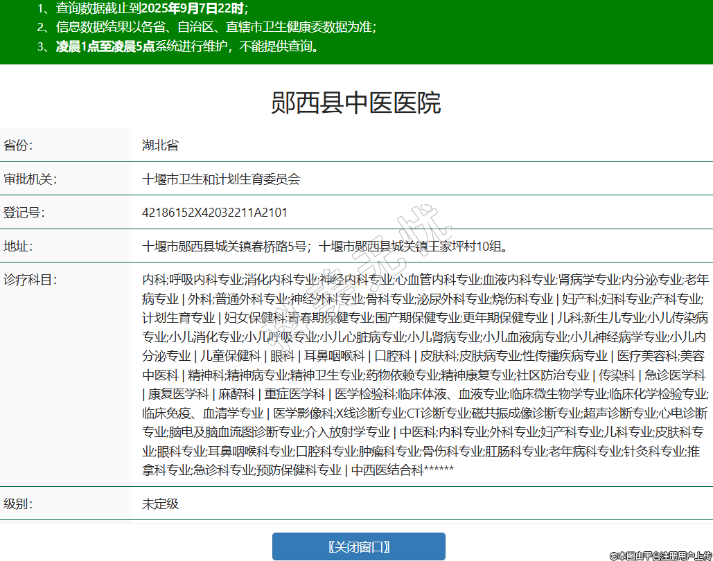 省份:湖北省審批機關(guān):十堰市衛(wèi)生和計劃生育委員會登記號:42186152X42032211A2101地址:十堰市鄖西縣城關(guān)鎮(zhèn)春橋路5號;十堰市鄖西縣城關(guān)鎮(zhèn)王家坪村10組。診療科目:內(nèi)科;呼吸內(nèi)科專業(yè);消化內(nèi)科專業(yè);神經(jīng)內(nèi)科專業(yè);心血管內(nèi)科專業(yè);血液內(nèi)科專業(yè);腎病學(xué)專業(yè);內(nèi)分泌專業(yè);老年病專業(yè) | 外科;普通外科專業(yè);神經(jīng)外科專業(yè);骨科專業(yè);泌尿外科專業(yè);燒傷科專業(yè) | 婦產(chǎn)科;婦科專業(yè);產(chǎn)科專業(yè);計劃生育專業(yè) | 婦女保健科;青春期保健專業(yè);圍產(chǎn)期保健專業(yè);更年期保健專業(yè) | 兒科;新生兒專業(yè);小兒傳染病專業(yè);小兒消化專業(yè);小兒呼吸專業(yè);小兒心臟病專業(yè);小兒腎病專業(yè);小兒血液病專業(yè);小兒神經(jīng)病學(xué)專業(yè);小兒內(nèi)分泌專業(yè) | 兒童保健科 | 眼科 | 耳鼻咽喉科 | 口腔科 | 皮膚科;皮膚病專業(yè);性傳播疾病專業(yè) | 醫(yī)療美容科;美容中醫(yī)科 | 精神科;精神病專業(yè);精神衛(wèi)生專業(yè);藥物依賴專業(yè);精神康復(fù)專業(yè);社區(qū)防治專業(yè) | 傳染科 | 急診醫(yī)學(xué)科 | 康復(fù)醫(yī)學(xué)科 | 麻醉科 | 重癥醫(yī)學(xué)科 | 醫(yī)學(xué)檢驗科;臨床體液、血液專業(yè);臨床微生物學(xué)專業(yè);臨床化學(xué)檢驗專業(yè);臨床免疫、血清學(xué)專業(yè) | 醫(yī)學(xué)影像科;X線診斷專業(yè);CT診斷專業(yè);磁共振成像診斷專業(yè);超聲診斷專業(yè);心電診斷專業(yè);腦電及腦血流圖診斷專業(yè);介入放射學(xué)專業(yè) | 中醫(yī)科;內(nèi)科專業(yè);外科專業(yè);婦產(chǎn)科專業(yè);兒科專業(yè);皮膚科專業(yè);眼科專業(yè);耳鼻咽喉科專業(yè);口腔科專業(yè);腫瘤科專業(yè);骨傷科專業(yè);肛腸科專業(yè);老年病科專業(yè);針灸科專業(yè);推拿科專業(yè);急診科專業(yè);預(yù)防保健科專業(yè) | 中西醫(yī)結(jié)合科******級別:未定級法定代表人:吳海新主要負(fù)責(zé)人:吳海新執(zhí)業(yè)許可證有效期:2016/11/15 -至- 2031/11/14 -