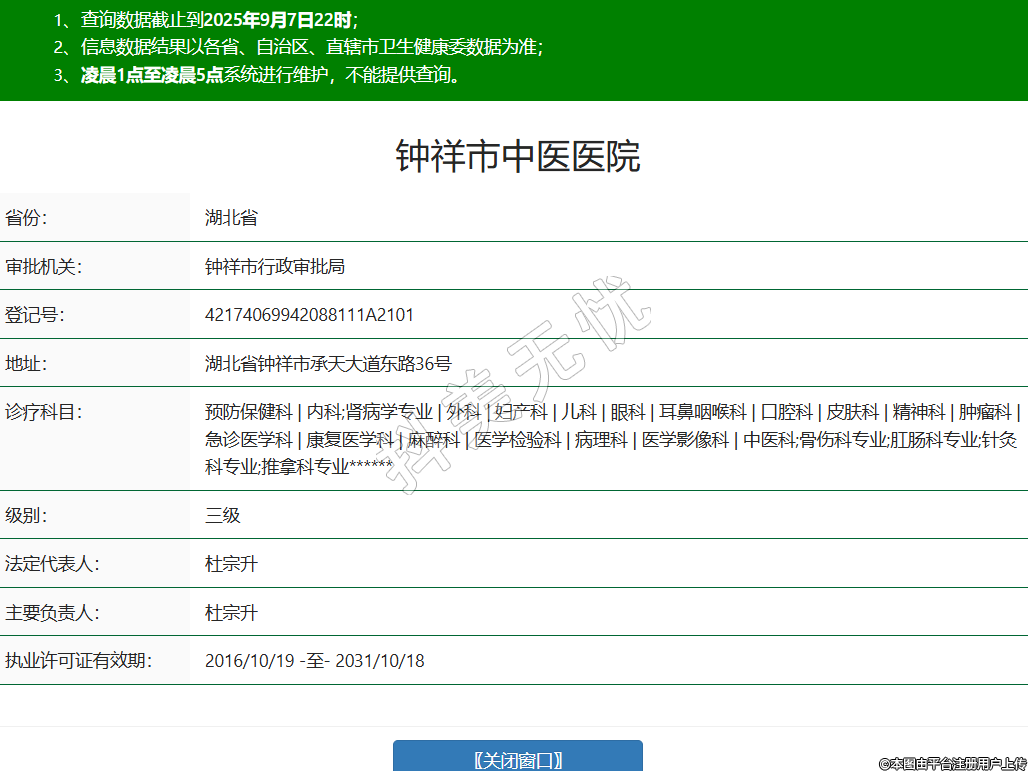 省份:湖北省審批機(jī)關(guān):鐘祥市行政審批局登記號:42174069942088111A2101地址:湖北省鐘祥市承天大道東路36號診療科目:預(yù)防保健科 | 內(nèi)科;腎病學(xué)專業(yè) | 外科 | 婦產(chǎn)科 | 兒科 | 眼科 | 耳鼻咽喉科 | 口腔科 | 皮膚科 | 精神科 | 腫瘤科 | 急診醫(yī)學(xué)科 | 康復(fù)醫(yī)學(xué)科 | 麻醉科 | 醫(yī)學(xué)檢驗(yàn)科 | 病理科 | 醫(yī)學(xué)影像科 | 中醫(yī)科;骨傷科專業(yè);肛腸科專業(yè);針灸科專業(yè);推拿科專業(yè)******級別:三級法定代表人:杜宗升主要負(fù)責(zé)人:杜宗升執(zhí)業(yè)許可證有效期:2016/10/19 -至- 2031/10/18 -