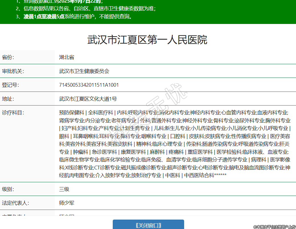 省份:湖北省審批機(jī)關(guān):武漢市衛(wèi)生健康委員會登記號:71450053342011511A1001地址:武漢市江夏區(qū)文化大道1號診療科目:預(yù)防保健科 | 全科醫(yī)療科 | 內(nèi)科;呼吸內(nèi)科專業(yè);消化內(nèi)科專業(yè);神經(jīng)內(nèi)科專業(yè);心血管內(nèi)科專業(yè);血液內(nèi)科專業(yè);腎病學(xué)專業(yè);內(nèi)分泌專業(yè);老年病專業(yè) | 外科;普通外科專業(yè);神經(jīng)外科專業(yè);骨科專業(yè);泌尿外科專業(yè);胸外科專業(yè) | 婦產(chǎn)科;婦科專業(yè);產(chǎn)科專業(yè);計劃生育專業(yè) | 兒科;新生兒專業(yè);小兒傳染病專業(yè);小兒消化專業(yè);小兒呼吸專業(yè) | 眼科 | 耳鼻咽喉科;耳科專業(yè);鼻科專業(yè);咽喉科專業(yè) | 口腔科 | 皮膚科;皮膚病專業(yè);性傳播疾病專業(yè) | 醫(yī)療美容科;美容外科;美容牙科;美容皮膚科 | 精神科;臨床心理專業(yè) | 傳染科;腸道傳染病專業(yè);呼吸道傳染病專業(yè);肝炎專業(yè) | 腫瘤科 | 急診醫(yī)學(xué)科 | 康復(fù)醫(yī)學(xué)科 | 麻醉科 | 疼痛科 | 重癥醫(yī)學(xué)科 | 醫(yī)學(xué)檢驗科;臨床體液、血液專業(yè);臨床微生物學(xué)專業(yè);臨床化學(xué)檢驗專業(yè);臨床免疫、血清學(xué)專業(yè);臨床細(xì)胞分子遺傳學(xué)專業(yè) | 病理科 | 醫(yī)學(xué)影像科;X線診斷專業(yè);CT診斷專業(yè);磁共振成像診斷專業(yè);超聲診斷專業(yè);心電診斷專業(yè);腦電及腦血流圖診斷專業(yè);神經(jīng)肌肉電圖專業(yè);介入放射學(xué)專業(yè);放射治療專業(yè) | 中醫(yī)科 | 中西醫(yī)結(jié)合科******級別:三級法定代表人:師少軍主要負(fù)責(zé)人:師少軍執(zhí)業(yè)許可證有效期:2018/11/08 -至- 2033/11/07 -