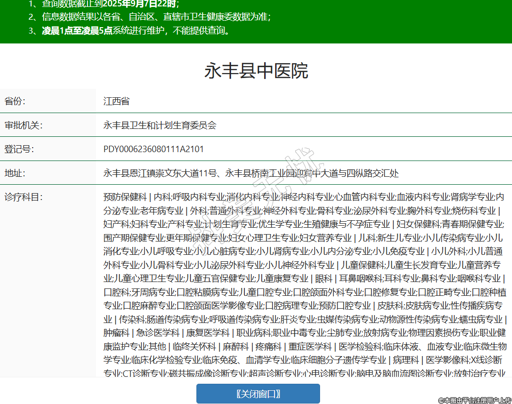 省份:江西省審批機(jī)關(guān):永豐縣衛(wèi)生和計(jì)劃生育委員會(huì)登記號(hào):PDY0006236080111A2101地址:永豐縣恩江鎮(zhèn)崇文東大道11號(hào)、永豐縣橋南工業(yè)園迎賓中大道與四縱路交匯處診療科目:預(yù)防保健科 | 內(nèi)科;呼吸內(nèi)科專業(yè);消化內(nèi)科專業(yè);神經(jīng)內(nèi)科專業(yè);心血管內(nèi)科專業(yè);血液內(nèi)科專業(yè);腎病學(xué)專業(yè);內(nèi)分泌專業(yè);老年病專業(yè) | 外科;普通外科專業(yè);神經(jīng)外科專業(yè);骨科專業(yè);泌尿外科專業(yè);胸外科專業(yè);燒傷科專業(yè) | 婦產(chǎn)科;婦科專業(yè);產(chǎn)科專業(yè);計(jì)劃生育專業(yè);優(yōu)生學(xué)專業(yè);生殖健康與不孕癥專業(yè) | 婦女保健科;青春期保健專業(yè);圍產(chǎn)期保健專業(yè);更年期保健專業(yè);婦女心理衛(wèi)生專業(yè);婦女營養(yǎng)專業(yè) | 兒科;新生兒專業(yè);小兒傳染病專業(yè);小兒消化專業(yè);小兒呼吸專業(yè);小兒心臟病專業(yè);小兒腎病專業(yè);小兒內(nèi)分泌專業(yè);小兒免疫專業(yè) | 小兒外科;小兒普通外科專業(yè);小兒骨科專業(yè);小兒泌尿外科專業(yè);小兒神經(jīng)外科專業(yè) | 兒童保健科;兒童生長發(fā)育專業(yè);兒童營養(yǎng)專業(yè);兒童心理衛(wèi)生專業(yè);兒童五官保健專業(yè);兒童康復(fù)專業(yè) | 眼科 | 耳鼻咽喉科;耳科專業(yè);鼻科專業(yè);咽喉科專業(yè) | 口腔科;牙周病專業(yè);口腔粘膜病專業(yè);兒童口腔專業(yè);口腔頜面外科專業(yè);口腔修復(fù)專業(yè);口腔正畸專業(yè);口腔種植專業(yè);口腔麻醉專業(yè);口腔頜面醫(yī)學(xué)影像專業(yè);口腔病理專業(yè);預(yù)防口腔專業(yè) | 皮膚科;皮膚病專業(yè);性傳播疾病專業(yè) | 傳染科;腸道傳染病專業(yè);呼吸道傳染病專業(yè);肝炎專業(yè);蟲媒傳染病專業(yè);動(dòng)物源性傳染病專業(yè);蠕蟲病專業(yè) | 腫瘤科 | 急診醫(yī)學(xué)科 | 康復(fù)醫(yī)學(xué)科 | 職業(yè)病科;職業(yè)中毒專業(yè);塵肺專業(yè);放射病專業(yè);物理因素?fù)p傷專業(yè);職業(yè)健康監(jiān)護(hù)專業(yè);其他 | 臨終關(guān)懷科 | 麻醉科 | 疼痛科 | 重癥醫(yī)學(xué)科 | 醫(yī)學(xué)檢驗(yàn)科;臨床體液、血液專業(yè);臨床微生物學(xué)專業(yè);臨床化學(xué)檢驗(yàn)專業(yè);臨床免疫、血清學(xué)專業(yè);臨床細(xì)胞分子遺傳學(xué)專業(yè) | 病理科 | 醫(yī)學(xué)影像科;X線診斷專業(yè);CT診斷專業(yè);磁共振成像診斷專業(yè);超聲診斷專業(yè);心電診斷專業(yè);腦電及腦血流圖診斷專業(yè);放射治療專業(yè) | 中醫(yī)科;內(nèi)科專業(yè);外科專業(yè);婦產(chǎn)科專業(yè);皮膚科專業(yè);眼科專業(yè);腫瘤科專業(yè);骨傷科專業(yè);肛腸科專業(yè);老年病科專業(yè);針灸科專業(yè);推拿科專業(yè);康復(fù)醫(yī)學(xué)專業(yè);預(yù)防保健科專業(yè) | 中西醫(yī)結(jié)合科******級(jí)別:三級(jí)法定代表人:廖永華主要負(fù)責(zé)人:廖永華執(zhí)業(yè)許可證有效期:2012/07/09 -至- 2027/07/01 -
