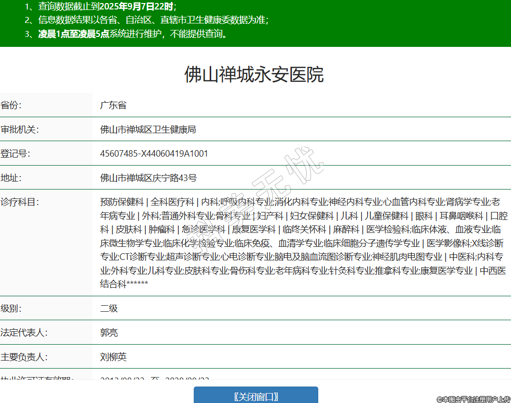 省份:廣東省審批機(jī)關(guān):佛山市禪城區(qū)衛(wèi)生健康局登記號:45607485-X44060419A1001地址:佛山市禪城區(qū)慶寧路43號診療科目:預(yù)防保健科 | 全科醫(yī)療科 | 內(nèi)科;呼吸內(nèi)科專業(yè);消化內(nèi)科專業(yè);神經(jīng)內(nèi)科專業(yè);心血管內(nèi)科專業(yè);腎病學(xué)專業(yè);老年病專業(yè) | 外科;普通外科專業(yè);骨科專業(yè) | 婦產(chǎn)科 | 婦女保健科 | 兒科 | 兒童保健科 | 眼科 | 耳鼻咽喉科 | 口腔科 | 皮膚科 | 腫瘤科 | 急診醫(yī)學(xué)科 | 康復(fù)醫(yī)學(xué)科 | 臨終關(guān)懷科 | 麻醉科 | 醫(yī)學(xué)檢驗科;臨床體液、血液專業(yè);臨床微生物學(xué)專業(yè);臨床化學(xué)檢驗專業(yè);臨床免疫、血清學(xué)專業(yè);臨床細(xì)胞分子遺傳學(xué)專業(yè) | 醫(yī)學(xué)影像科;X線診斷專業(yè);CT診斷專業(yè);超聲診斷專業(yè);心電診斷專業(yè);腦電及腦血流圖診斷專業(yè);神經(jīng)肌肉電圖專業(yè) | 中醫(yī)科;內(nèi)科專業(yè);外科專業(yè);兒科專業(yè);皮膚科專業(yè);骨傷科專業(yè);老年病科專業(yè);針灸科專業(yè);推拿科專業(yè);康復(fù)醫(yī)學(xué)專業(yè) | 中西醫(yī)結(jié)合科******級別:二級法定代表人:郭亮主要負(fù)責(zé)人:劉柳英執(zhí)業(yè)許可證有效期:2013/08/23 -至- 2028/08/23 -