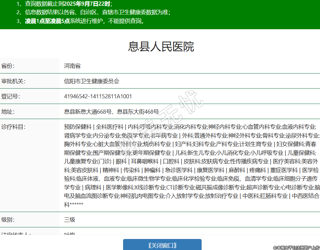 省份:河南省審批機(jī)關(guān):信陽市衛(wèi)生健康委員會登記號:41946542-141152811A1001地址:息縣新息大道668號、息縣東大街468號診療科目:預(yù)防保健科 | 全科醫(yī)療科 | 內(nèi)科;呼吸內(nèi)科專業(yè);消化內(nèi)科專業(yè);神經(jīng)內(nèi)科專業(yè);心血管內(nèi)科專業(yè);血液內(nèi)科專業(yè);腎病學(xué)專業(yè);內(nèi)分泌專業(yè);免疫學(xué)專業(yè);老年病專業(yè) | 外科;普通外科專業(yè);神經(jīng)外科專業(yè);骨科專業(yè);泌尿外科專業(yè);胸外科專業(yè);心臟大血管外科專業(yè);燒傷科專業(yè) | 婦產(chǎn)科;婦科專業(yè);產(chǎn)科專業(yè);計(jì)劃生育專業(yè) | 婦女保健科;青春期保健專業(yè);圍產(chǎn)期保健專業(yè);更年期保健專業(yè) | 兒科;新生兒專業(yè);小兒消化專業(yè);小兒呼吸專業(yè) | 兒童保健科;兒童康復(fù)專業(yè)(門診) | 眼科 | 耳鼻咽喉科 | 口腔科 | 皮膚科;皮膚病專業(yè);性傳播疾病專業(yè) | 醫(yī)療美容科;美容外科;美容皮膚科 | 精神科 | 傳染科 | 腫瘤科 | 急診醫(yī)學(xué)科 | 康復(fù)醫(yī)學(xué)科 | 麻醉科 | 疼痛科 | 重癥醫(yī)學(xué)科 | 醫(yī)學(xué)檢驗(yàn)科;臨床體液、血液專業(yè);臨床微生物學(xué)專業(yè);臨床化學(xué)檢驗(yàn)專業(yè);臨床免疫、血清學(xué)專業(yè);臨床細(xì)胞分子遺傳學(xué)專業(yè) | 病理科 | 醫(yī)學(xué)影像科;X線診斷專業(yè);CT診斷專業(yè);磁共振成像診斷專業(yè);超聲診斷專業(yè);心電診斷專業(yè);腦電及腦血流圖診斷專業(yè);神經(jīng)肌肉電圖專業(yè);介入放射學(xué)專業(yè);放射治療專業(yè) | 中醫(yī)科;肛腸科專業(yè) | 中西醫(yī)結(jié)合科******級別:三級法定代表人:葉梅主要負(fù)責(zé)人:***執(zhí)業(yè)許可證有效期:2025/08/20 -至- 2036/01/14 -