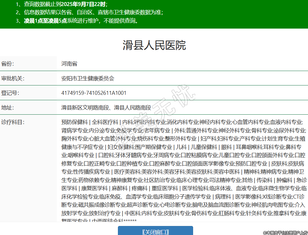 省份:河南省審批機(jī)關(guān):安陽市衛(wèi)生健康委員會(huì)登記號:41749159-741052611A1001地址:滑縣新區(qū)文明路南段、滑縣人民路南段診療科目:預(yù)防保健科 | 全科醫(yī)療科 | 內(nèi)科;呼吸內(nèi)科專業(yè);消化內(nèi)科專業(yè);神經(jīng)內(nèi)科專業(yè);心血管內(nèi)科專業(yè);血液內(nèi)科專業(yè);腎病學(xué)專業(yè);內(nèi)分泌專業(yè);免疫學(xué)專業(yè);老年病專業(yè) | 外科;普通外科專業(yè);神經(jīng)外科專業(yè);骨科專業(yè);泌尿外科專業(yè);胸外科專業(yè);心臟大血管外科專業(yè);燒傷科專業(yè);整形外科專業(yè) | 婦產(chǎn)科;婦科專業(yè);產(chǎn)科專業(yè);計(jì)劃生育專業(yè);生殖健康與不孕癥專業(yè) | 婦女保健科;圍產(chǎn)期保健專業(yè) | 兒科 | 兒童保健科 | 眼科 | 耳鼻咽喉科;耳科專業(yè);鼻科專業(yè);咽喉科專業(yè) | 口腔科;牙體牙髓病專業(yè);牙周病專業(yè);口腔粘膜病專業(yè);兒童口腔專業(yè);口腔頜面外科專業(yè);口腔修復(fù)專業(yè);口腔正畸專業(yè);口腔種植專業(yè);口腔麻醉專業(yè);口腔頜面醫(yī)學(xué)影像專業(yè);預(yù)防口腔專業(yè) | 皮膚科;皮膚病專業(yè);性傳播疾病專業(yè) | 醫(yī)療美容科;美容外科;美容牙科;美容皮膚科;美容中醫(yī)科 | 精神科;精神病專業(yè);精神衛(wèi)生專業(yè);藥物依賴專業(yè);精神康復(fù)專業(yè);社區(qū)防治專業(yè);臨床心理專業(yè);司法精神專業(yè);其他 | 傳染科 | 腫瘤科 | 急診醫(yī)學(xué)科 | 康復(fù)醫(yī)學(xué)科 | 麻醉科 | 疼痛科 | 重癥醫(yī)學(xué)科 | 醫(yī)學(xué)檢驗(yàn)科;臨床體液、血液專業(yè);臨床微生物學(xué)專業(yè);臨床化學(xué)檢驗(yàn)專業(yè);臨床免疫、血清學(xué)專業(yè);臨床細(xì)胞分子遺傳學(xué)專業(yè) | 病理科 | 醫(yī)學(xué)影像科;X線診斷專業(yè);CT診斷專業(yè);磁共振成像診斷專業(yè);超聲診斷專業(yè);心電診斷專業(yè);腦電及腦血流圖診斷專業(yè);神經(jīng)肌肉電圖專業(yè);介入放射學(xué)專業(yè);放射治療專業(yè) | 中醫(yī)科;內(nèi)科專業(yè);皮膚科專業(yè);骨傷科專業(yè);肛腸科專業(yè);針灸科專業(yè);推拿科專業(yè);康復(fù)醫(yī)學(xué)專業(yè) | 中西醫(yī)結(jié)合科******級別:三級法定代表人:李鳳壘主要負(fù)責(zé)人:執(zhí)業(yè)許可證有效期:2025/01/03 -至- 2035/12/28 -