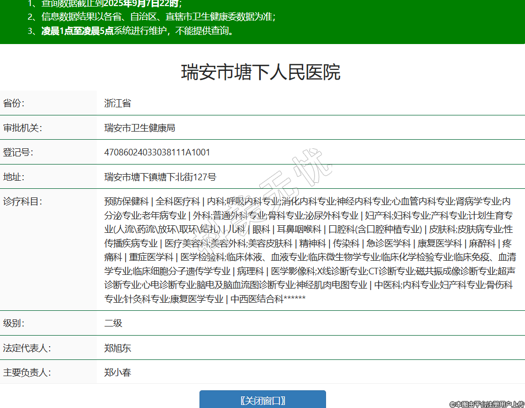瑞安市塘下人民醫(yī)院,診療科目:預(yù)防保健科 | 全科醫(yī)療科 | 內(nèi)科 | 外科 | 兒科 | 眼科 | 耳鼻咽喉科 | 口腔科(含口腔種植專業(yè)) | 皮膚科;皮膚病專業(yè);性傳播疾病專業(yè) | 醫(yī)療美容科;美容外科;美容皮膚科 | 中西醫(yī)結(jié)合科******