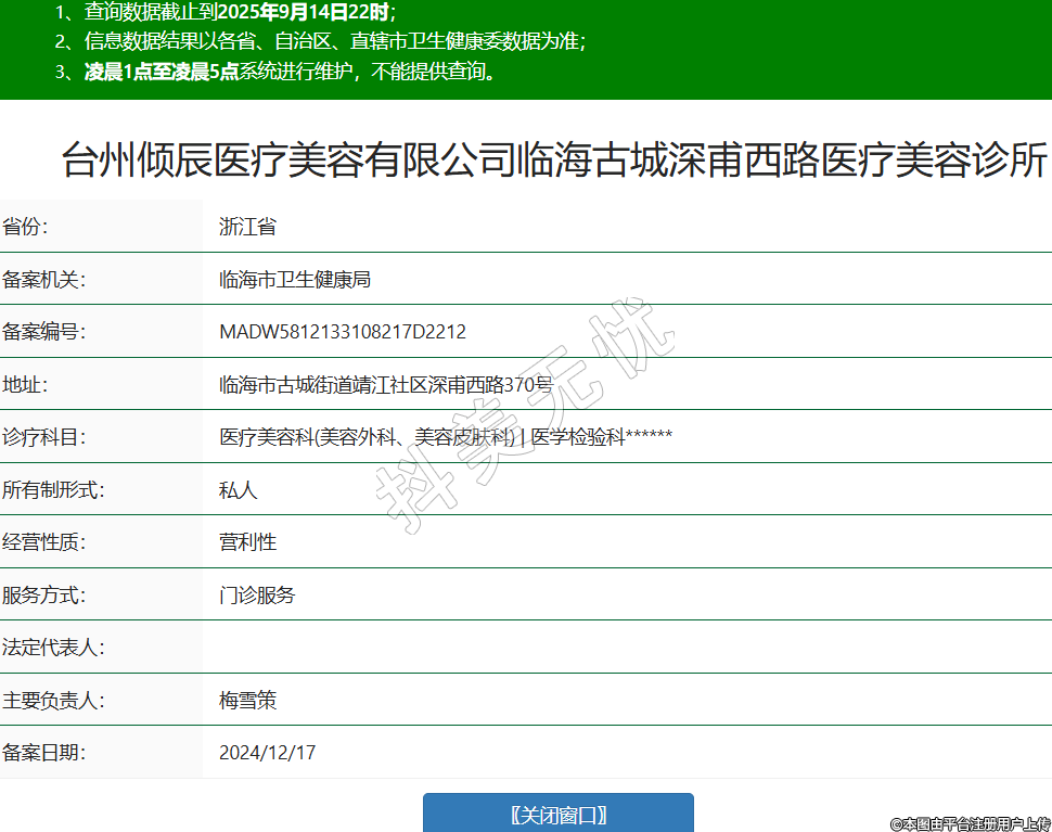 省份:浙江省備案機(jī)關(guān):臨海市衛(wèi)生健康局備案編號(hào):MADW5812133108217D2212地址:臨海市古城街道靖江社區(qū)深甫西路370號(hào)診療科目:醫(yī)療美容科(美容外科、美容皮膚科) | 醫(yī)學(xué)檢驗(yàn)科******所有制形式:私人經(jīng)營(yíng)性質(zhì):營(yíng)利性服務(wù)方式:門診服務(wù)法定代表人:主要負(fù)責(zé)人:梅雪策備案日期:2024/12/17 -