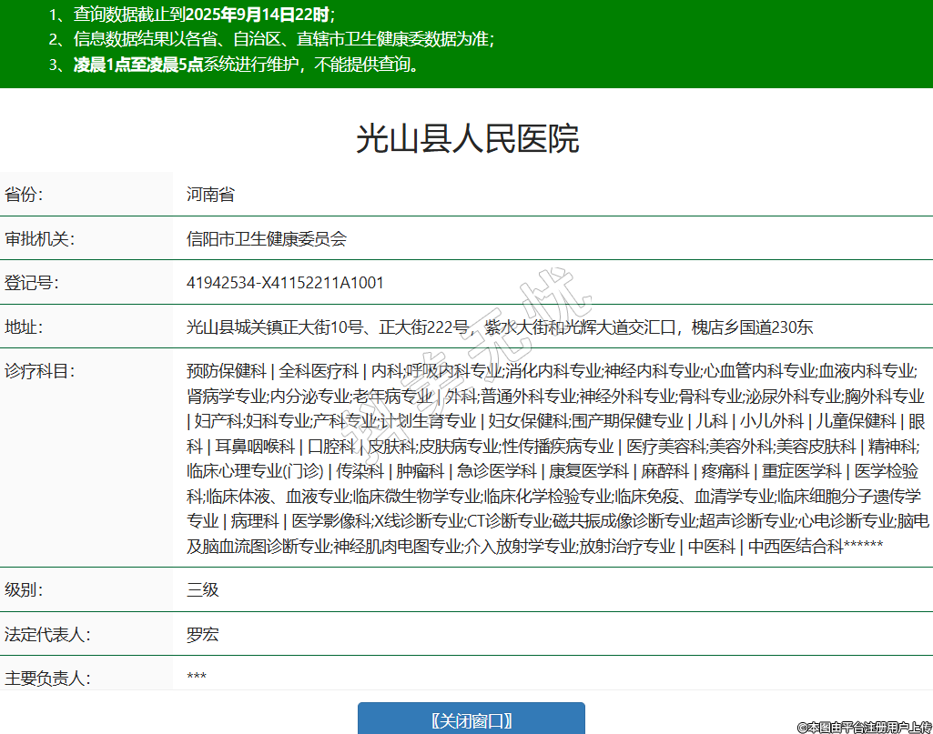 省份:河南省審批機(jī)關(guān):信陽(yáng)市衛(wèi)生健康委員會(huì)登記號(hào):41942534-X41152211A1001地址:光山縣城關(guān)鎮(zhèn)正大街10號(hào)、正大街222號(hào),紫水大街和光輝大道交匯口,槐店鄉(xiāng)國(guó)道230東診療科目:預(yù)防保健科 | 全科醫(yī)療科 | 內(nèi)科;呼吸內(nèi)科專業(yè);消化內(nèi)科專業(yè);神經(jīng)內(nèi)科專業(yè);心血管內(nèi)科專業(yè);血液內(nèi)科專業(yè);腎病學(xué)專業(yè);內(nèi)分泌專業(yè);老年病專業(yè) | 外科;普通外科專業(yè);神經(jīng)外科專業(yè);骨科專業(yè);泌尿外科專業(yè);胸外科專業(yè) | 婦產(chǎn)科;婦科專業(yè);產(chǎn)科專業(yè);計(jì)劃生育專業(yè) | 婦女保健科;圍產(chǎn)期保健專業(yè) | 兒科 | 小兒外科 | 兒童保健科 | 眼科 | 耳鼻咽喉科 | 口腔科 | 皮膚科;皮膚病專業(yè);性傳播疾病專業(yè) | 醫(yī)療美容科;美容外科;美容皮膚科 | 精神科;臨床心理專業(yè)(門診) | 傳染科 | 腫瘤科 | 急診醫(yī)學(xué)科 | 康復(fù)醫(yī)學(xué)科 | 麻醉科 | 疼痛科 | 重癥醫(yī)學(xué)科 | 醫(yī)學(xué)檢驗(yàn)科;臨床體液、血液專業(yè);臨床微生物學(xué)專業(yè);臨床化學(xué)檢驗(yàn)專業(yè);臨床免疫、血清學(xué)專業(yè);臨床細(xì)胞分子遺傳學(xué)專業(yè) | 病理科 | 醫(yī)學(xué)影像科;X線診斷專業(yè);CT診斷專業(yè);磁共振成像診斷專業(yè);超聲診斷專業(yè);心電診斷專業(yè);腦電及腦血流圖診斷專業(yè);神經(jīng)肌肉電圖專業(yè);介入放射學(xué)專業(yè);放射治療專業(yè) | 中醫(yī)科 | 中西醫(yī)結(jié)合科******級(jí)別:三級(jí)法定代表人:羅宏主要負(fù)責(zé)人:***執(zhí)業(yè)許可證有效期:2025/04/22 -至- 2036/01/14 -